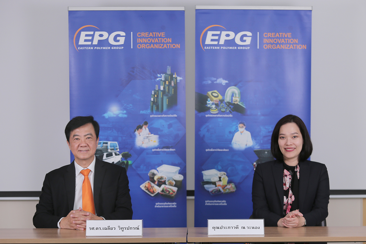 มิติหุ้น – รศ.ดร.เฉลียว วิทูรปกรณ์ (ซ้าย) รองประธานเจ้าหน้าที่บริหาร และ นางสาวประภาวดี ณ ระนอง (ขวา) ผู้ช่วยผู้อำนวยการ ฝ่ายนักลงทุนสัมพันธ์ บริษัท อีสเทิร์นโพลีเมอร์ กรุ๊ป จำกัด (มหาชน) หรือ EPG ร่วมงานบริษัทจดทะเบียนพบผู้