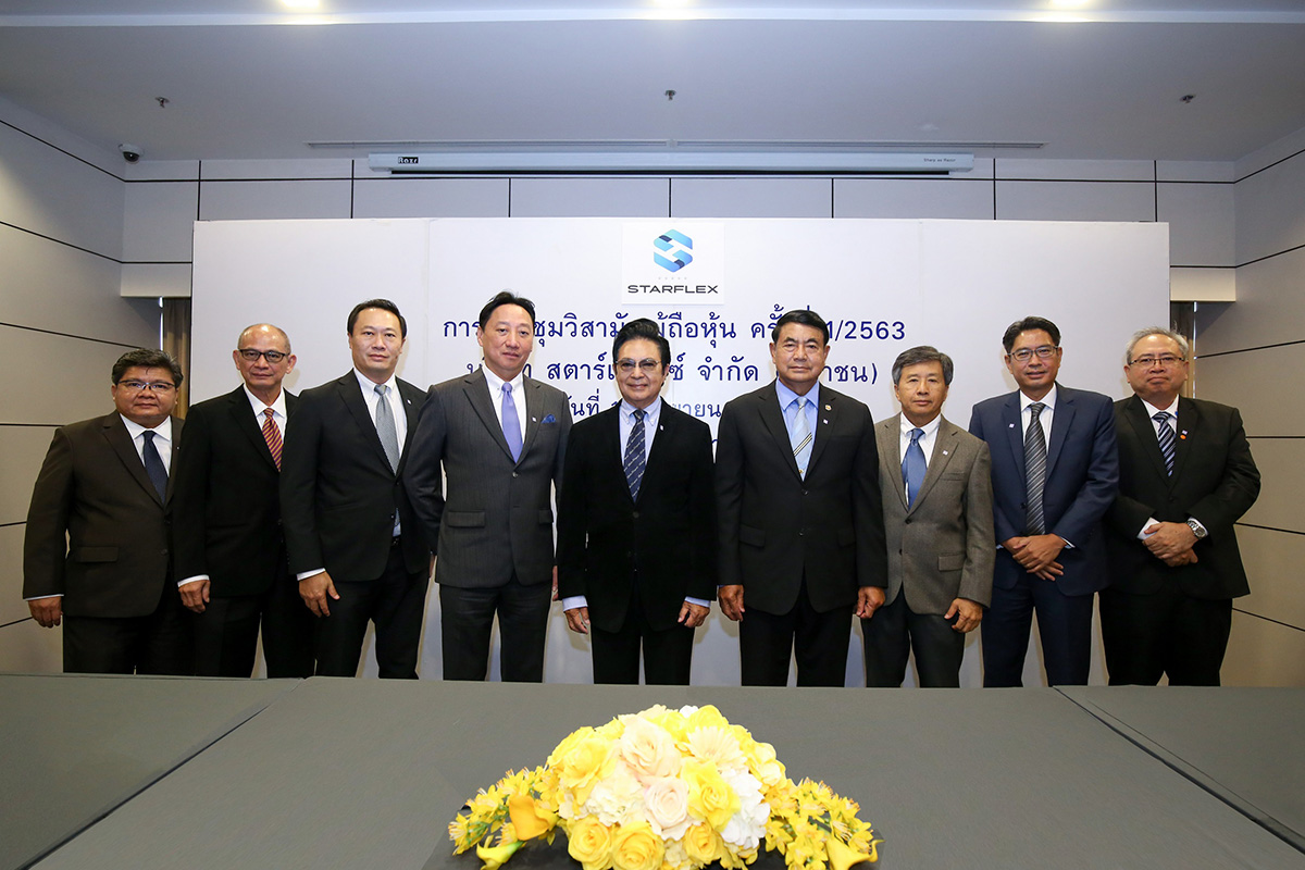 มิติหุ้น – นายปกรณ์ มาลากุล ณ อยุธยา (กลาง) ประธานกรรมการ นายปรินทร์ธรณ์ อภิธนาศรีวงศ์ (ที่ 4 จากซ้าย) ประธานกรรมการบริหาร ดร.สมโภชน์ วัลยะเสวี (ที่ 2 จากขวา) ประธานเจ้าหน้าที่บริหารและคณะกรรมการ บริษัท สตาร์เฟล็กซ์ จำกัด (มหาชน) หรือ SFLEX ถ่ายภาพเป็นที่ระลึก เนื่องในโอกาส จัดงานประชุมวิสามัญผู้ถือหุ้นครั้งที่ 1/2563 โดยผู้ถือหุ้นมีมติเห็นชอบการเปลี่ยนแปลงมูลค่าหุ้นที่ตราไว้ (พาร์) จากเดิมหุ้นละ 1 บาท เป็นมูลค่าหุ้นที่ตราไว้หุ้นละ 0.50 บาท ซึ่งจะทำให้หุ้นสามัญของบริษัท มีการเปลี่ยนแปลงจาก 410 ล้านหุ้น เป็นจำนวน 820 ล้านหุ้น เพื่อเป็นการเพิ่มสภาพคล่องและเพิ่มปริมาณหุ้นในตลาดฯ ทั้งนี้ ในที่ประชุมฯ ผู้บริหารได้ยืนยันผลประกอบการเป็นไปตามประมาณการไร้ผลกระทบ COVID-19 และภาวะเศรษฐกิจในปัจจุบัน โดยงานดังกล่าวจัดขึ้น ณ ห้องประชุม 211-212 ศูนย์นิทรรศการและการประชุมไบเทค บางนา เมื่อวันที่ 11 กันยายน 2563 ที่ผ่านมา