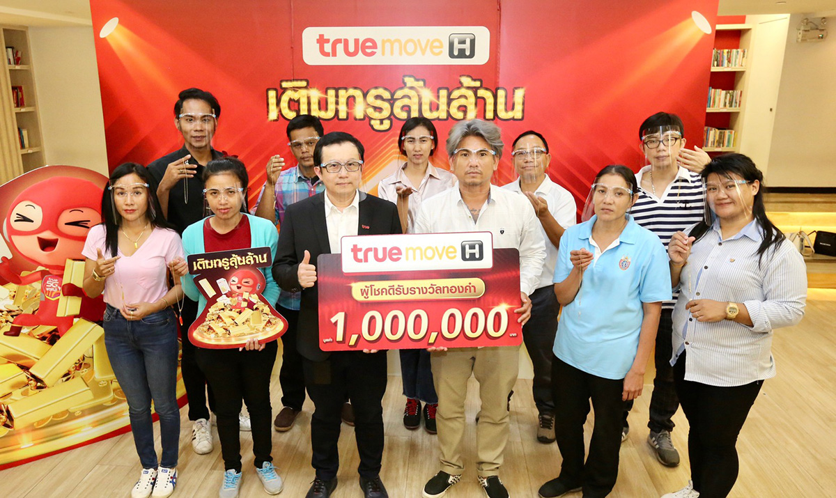 มิติหุ้น – รวยส่งท้ายแคมเปญ “เติมทรูลุ้นล้าน” จาก ทรูมูฟ เอช โดย นายทวี ชีวชื่น (ที่2จากซ้าย) ผู้อำนวยการ ธุรกิจโมบายล์ สายงานโมบายล์ พรีเพย์ บมจ.ทรู คอร์ปอเรชั่น มอบทองคำแท่งมูลค่า 1 ล้านบาท แก่นายณพิพัฒน์ วัฒนดิลก (ขวาสุด)หนุ่มดวงดีจากกรุงเทพฯ ที่คว้าทองล้านไปครอง และผู้โชคดีอีก 10 ท่าน ที่ได้รับสร้อยคอทองคำมูลค่า 10,000 บาท รวยถ้วนหน้าปิดท้ายแคมเปญใหญ่ “เติมทรูลุ้นล้าน”ที่มอบทองแก่ผู้โชคดีไปแล้วทั้งหมด62 คน รวมมูลค่า 2.6 ล้านบาท ตลอดแคมเปญ