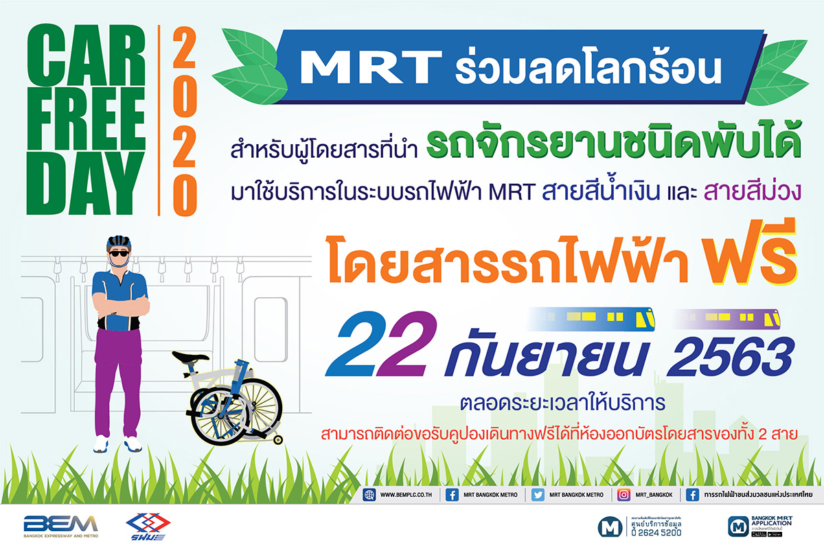มิติหุ้น – การรถไฟฟ้าขนส่งมวลชนแห่งประเทศไทย (รฟม.) และ บริษัท ทางด่วนและรถไฟฟ้ากรุงเทพ จำกัด (มหาชน) (BEM) ร่วมรณรงค์ลดโลกร้อน “ 22 กันยายน Car Free Day ” เพื่อช่วยลดปัญหาการจราจร รักษาสิ่งแวดล้อม ลดมลพิษทางเสียง ทางอากาศ และลดฝุ่นละออง PM 2.5 พร้อมทั้งส่งเสริมให้ประชาชนหันมาใช้ระบบขนส่งมวลชนสาธารณะ ด้วยการยกเว้นค่าโดยสาร สำหรับผู้ที่นำรถจักรยานชนิดพับได้มาเดินทางรถไฟฟ้ามหานคร สายเฉลิมรัชมงคล (สายสีน้ำเงิน) และสายฉลองรัชธรรม (สายสีม่วง) ในวันที่ 22 กันยายน 2563 ตลอดระยะเวลาการให้บริการ โดยสามารถติดต่อขอรับคูปองเดินทางฟรีได้ที่ห้องออกบัตรโดยสารของทั้ง 2 สาย