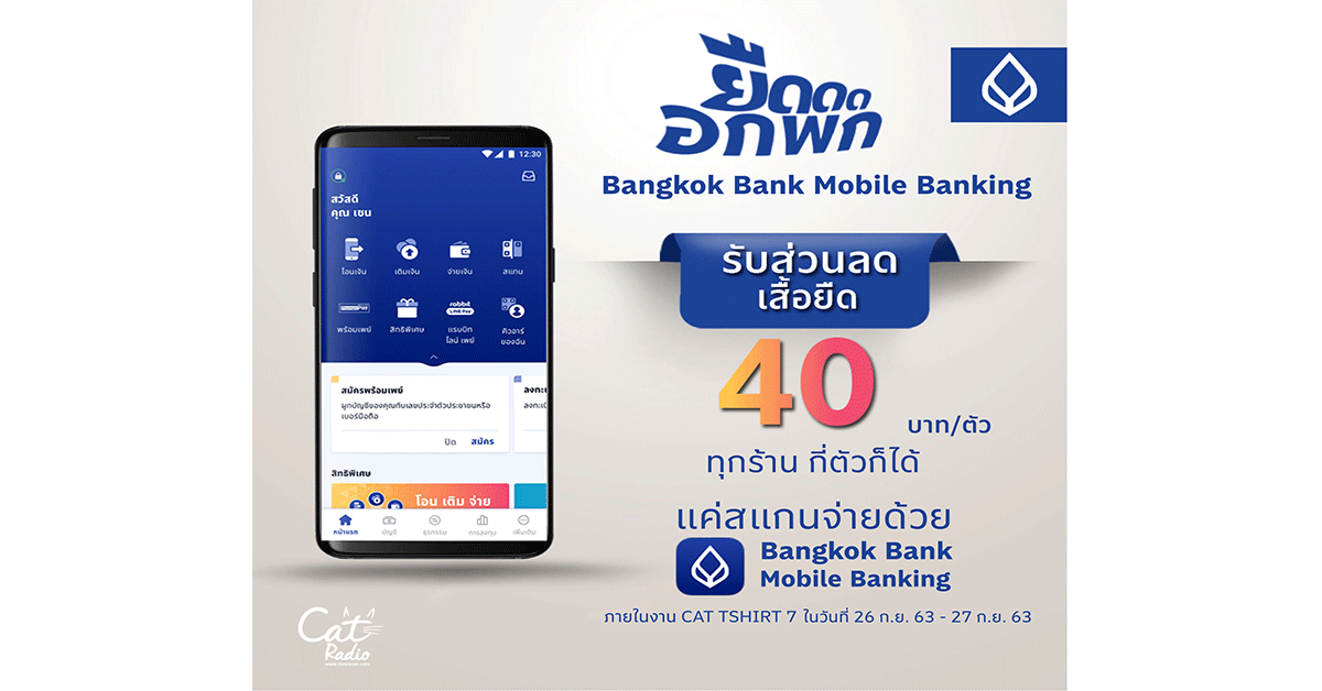 มิติหุ้น-ธนาคารกรุงเทพ เชื่อมแบรนด์เข้าถึงกลุ่มคนรุ่นใหม่ ร่วมเทศกาลเสื้อยืดประจำปีสุดชิค ‘CAT TSHIRT7’ พร้อมโปรโมชั่นเอาใจเด็กแนว มอบส่วนลดเสื้อยืด 40 บาท ทุกตัว ทุกร้าน ตลอดทั้งงาน โดยไม่จำกัดจำนวน เพียงสแกนจ่ายค่าเสื้อในงานด้วย Bangkok Bank Mobile Banking ระหว่าง 26 -27 กันยายน 2563 บริเวณชั้น 2, 3 แอร์พอร์ต เรล ลิงก์ สถานีมักกะสัน ประตูเปิดตั้งแต่ 11.00 น. เป็นต้นไป