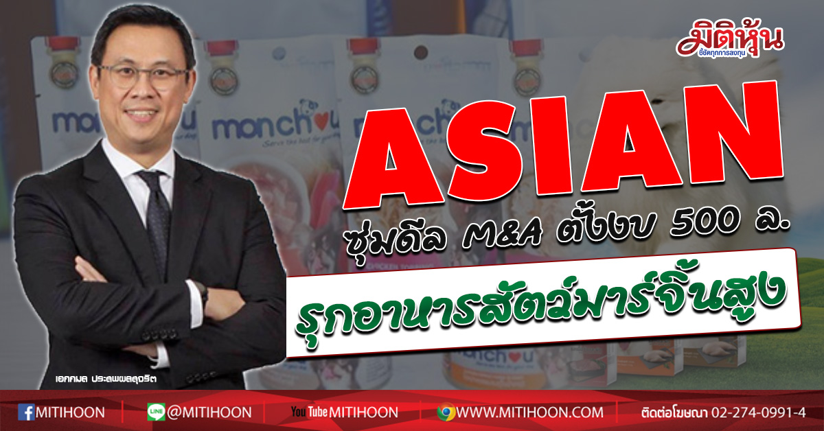 ผู้สื่อข่าว “มิติหุ้น” รายงานว่า บมจ.เอเชี่ยนซี คอร์ปอเรชั่น หรือ ASIAN ดำเนินธุรกิจประเภทอุตสาหกรรมแปรรูปสัตว์น้ำ แช่แข็ง จำหน่าย และส่งออก โดยนาย”เอกกมล ประสพผลสุจริต” ซีเอฟโอคนใหม่ไฟแรง อดีตผู้บริหารโรงแรมดุสิตธานี ที่เพิ่งเข้ารับตำแหน่ง 17 ส.ค. ที่ผ่านมา เปิดเผยว่า บริษัทอยู่ระหว่างศึกษาดีล M&A ธุรกิจที่เกี่ยวเนื่องเพื่อต่อยอดกลุ่มธุรกิจของบริษัท และช่วยเพิ่มศักยภาพด้านกำลังผลิต ซึ่งเบื้องต้นศึกษาไว้ 2 ธุรกิจเกี่ยวเนื่อง ได้แก่ “ธุรกิจผลิตอาหารสัตว์เลี้ยง” และ “ธุรกิจสนับสนุนด้านขนส่งและส่งออก” โดยตั้งงบลงทุนไว้ราว 500 ล้านบาท ซึ่งบริษัทมีกระแสเงินสดและแหล่งเงินทุนเพียงพอ