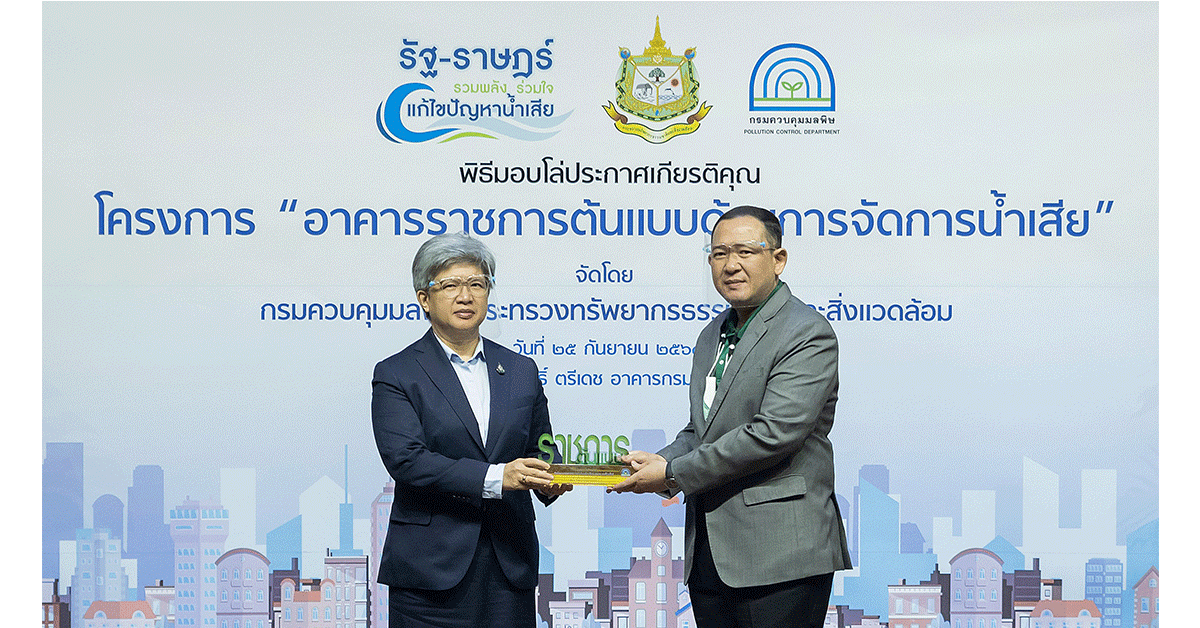 ทั้งนี้ กรมควบคุมมลพิษได้ดำเนินโครงการอาคารราชการต้นแบบด้านการจัดการน้ำเสีย ประจำปีงบประมาณ พ.ศ. 2563 ร่วมกับสำนักงานสิ่งแวดล้อมภาคที่ 1 – 16 โดยมีหน่วยงานสมัครร่วมโครงการทั้งสิ้น 179 หน่วยงาน ซึ่งหน่วยงานที่ผ่านเกณฑ์การประเมินจะได้รับการยกย่องเป็น “อาคารราชการต้นแบบด้านการจัดการน้ำเสีย” แบ่งออกเป็น 3 ระดับ ได้แก่ ระดับทอง ระดับเงิน และระดับทองแดง