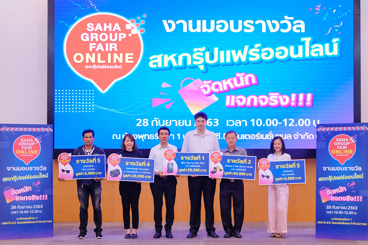 มิติหุ้น – นายฐิติภูมิ โชควัฒนา (ที่ 4 จากซ้าย) ผู้อำนวยการฝ่าย บริษัท ไอ.ซี.ซี. อินเตอร์เนชั่นแนล จำกัด (มหาชน) ในฐานะผู้แทนการจัด “งานสหกรุ๊ปแฟร์ออนไลน์ ปี 63” มอบรางวัลให้กับผู้โชคดี