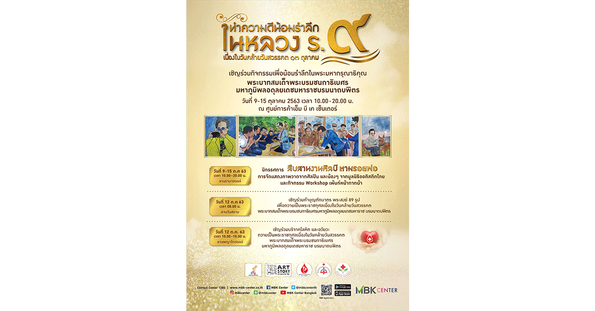 มิติหุ้น-เนื่องในวันคล้ายวันสวรรคต พระบาทสมเด็จพระบรมชนกาธิเบศร มหาภูมิพลอดุลยเดชมหาราช บรมนาถบพิตร 13 ตุลาคม 2563 ศูนย์การค้าเอ็ม บี เค เซ็นเเตอร์ ขอเชิญชวนเหล่าพสกนิกร ร่วมทำความดีเพื่อถวายเป็นพระราชกุศล และน้อมรำลึกถึงพระมหากรุณาธิคุณ ผ่านกิจกรรม ดังนี้