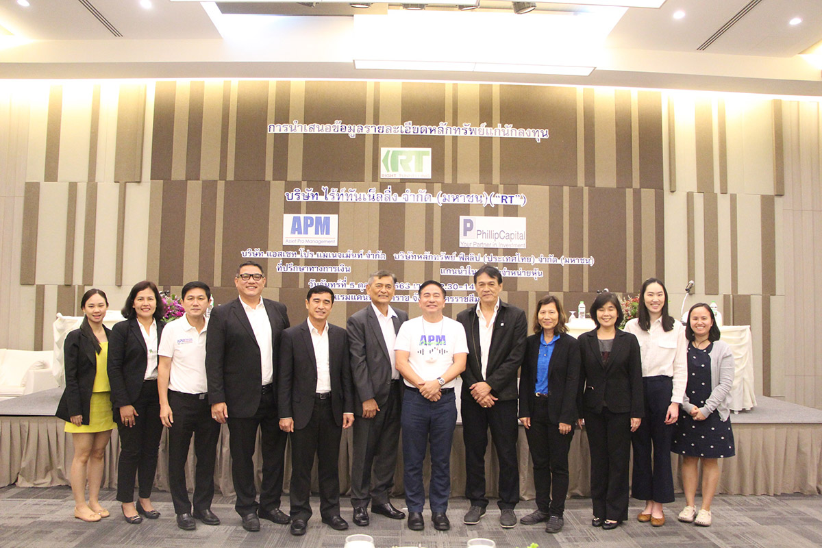มิติหุ้น – นายชวลิต ถนอมถิ่น ประธานเจ้าหน้าที่บริหาร นายสุรศักดิ์ สีเขียว กรรมการผู้จัดการ นายธีรยุทธ ชูศิลป์ และ นายไชยา วงศ์ลาภพานิช กรรมการบริษัท ไร้ท์ ทันเน็ลลิ่ง จำกัด (มหาชน) (RT) พร้อมด้วยนายสมภพ ศักดิ์พันธ์พนม ประธานกรรมการ นายเสกสรรค์ ธโนปจัย ประธานเจ้าหน้าที่บริหาร บริษัท แอสเซท โปร แมเนจเม้นท์ จำกัด (APM) ที่ปรึกษาทางการเงิน และนางสาววิจันทร์ รัตนกิตติ