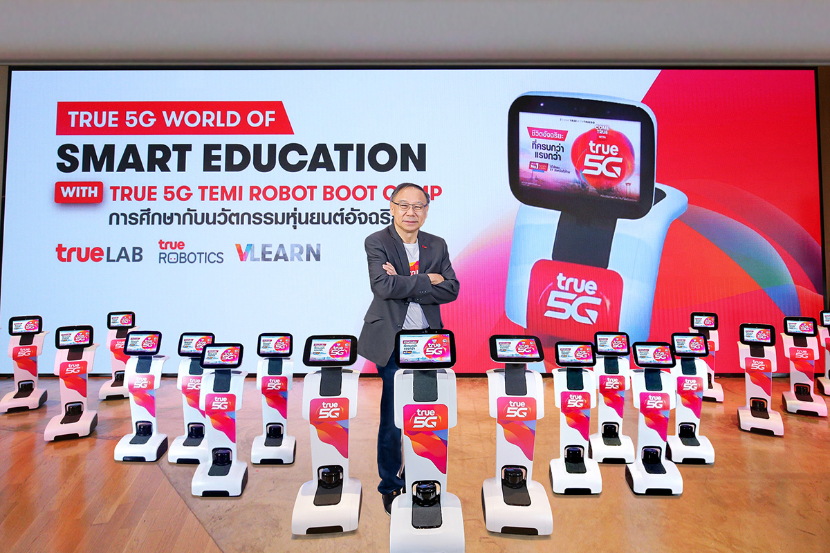 นายอาณัติ เมฆไพบูลย์วัฒนา กรรมการผู้จัดการใหญ่ (ร่วม) บมจ.ทรู คอร์ปอเรชั่น กล่าวว่า การสนับสนุนภาคการศึกษาไทยเป็นอีกหนึ่งความมุ่งมั่นของกลุ่มทรูมาโดยตลอด โดยเฉพาะการนำศักยภาพด้านเทคโนโลยีสื่อสารร่วมสร้างโอกาสและเพิ่มการเข้าถึงองค์ความรู้แก่เยาวชนไทยในทุกรูปแบบ ซึ่งโครงการ True5G World of Smart Education with Temi Robot Bootcamp นับเป็นโอกาสดีที่กลุ่มทรูจะนำศักยภาพความอัจฉริยะของทรู 5G ร่วมสร้างระบบนิเวศด้านดิจิทัลให้วงการการศึกษาไทยอีกครั้ง พร้อมนำองค์ความรู้ที่กลุ่มทรูมีอยู่ร่วมยกระดับวงการศึกษาระดับอุดมศึกษาให้ก้าวสู่ Smart Education Smart University อย่างยั่งยืน โดยส่งมอบหุ่นยนต์อัจฉริยะ True5G Temi Connect & Carebot ให้แก่พันธมิตรสถาบันการศึกษา 20 มหาวิทยาลัยทั่วประเทศ ทั้งยังจัด Bootcamp อบรมผ่านแพลตฟอร์ม “VLEARN” นำความรู้ความเชี่ยวชาญในฐานะผู้นำด้านดิจิทัลเทคโนโลยีครบวงจร ที่มีโซลูชันและเทคโนโลยีอัจฉริยะ ทั้ง AI, Robotics, Deep Data Analytics และ Smart IoT เสริมการเรียนรู้นอกห้องเรียน ให้นิสิตนักศึกษามีความรู้เบื้องต้นด้านเทคโนโลยี 5G และหุ่นยนต์ รวมถึงการเขียนโปรแกรมของหุ่นยนต์ โดยใช้หุ่นยนต์อัจฉริยะ True5G Temi Connect & Carebot ผ่านเครือข่ายอัจฉริยะ True5G ในการพัฒนานวัตกรรม ต่อยอดไอเดียให้เป็นรูปธรรม โดยรับโจทย์จากห้างสรรพสินค้า แล้วนำมาพัฒนาสร้างโปรแกรม เพื่อให้เกิดการใช้งานหุ่นยนต์ได้จริง ซึ่งจะช่วยพัฒนาทักษะให้นิสิตนักศึกษาสามารถต่อยอดไปเป็นสตาร์ทอัพได้ในอนาคต