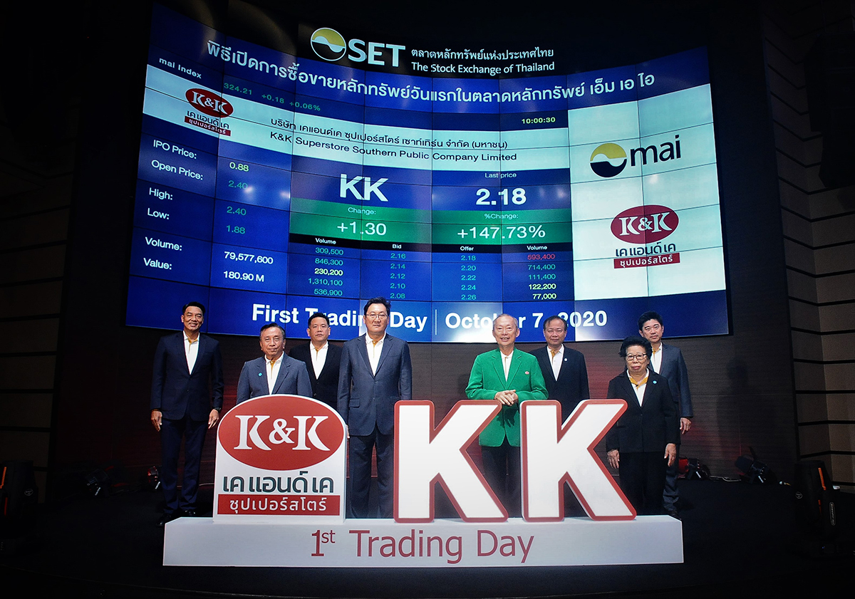 มิติหุ้น – หุ้นน้องใหม่ป้ายแดง บมจ.เคแอนด์เค ซุปเปอร์สโตร์ เซาท์เทิร์น (KK) เข้าเทรดในตลาดหลักทรัพย์ mai วันแรก สร้างผลตอบสุดประทับใจ โดยเปิดตลาดที่ 2.40 บาท/หุ้น เพิ่มขึ้น 1.52 บาท หรือเพิ่มขึ้น 172.73% เมื่อเปรียบเทียบกับราคาไอพีโอที่ 0.88 บาท/หุ้น สะท้อนนักลงทุนมั่นใจอนาคตสดใส “กวิศพงษ์ สิริธนนนท์สกุล ” ระบุจากนี้ขอเดินหน้าขยายธุรกิจให้เติบโตอย่างมีศักยภาพ เพื่อสร้างผลตอบแทนให้กับผู้ถือหุ้นอย่างดีที่สุด