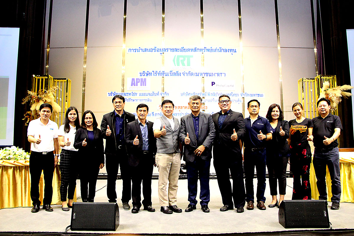 มิติหุ้น – นายชวลิต ถนอมถิ่น ประธานเจ้าหน้าที่บริหาร นายสุรศักดิ์ สีเขียว กรรมการผู้จัดการ นายธีรยุทธ ชูศิลป์ และ นายไชยา วงศ์ลาภพานิช กรรมการ บริษัท ไร้ท์ทันเน็ลลิ่ง จำกัด (มหาชน) (RT) พร้อมด้วยนายสมภพ ศักดิ์พันธ์พนม ประธานกรรมการ นายเสกสรรค์ ธโนปจัย ประธานเจ้าหน้าที่บริหาร บริษัท แอสเซท โปร แมเนจเม้นท์ จำกัด (APM) ที่ปรึกษาทางการเงิน และนายวิชา โตมานะ กรรมการผู้จัดการ ฝ่ายวาณิชธนกิจ บริษัทหลักทรัพย์ ฟิลลิป (ประเทศไทย) จำกัด (มหาชน) (PST) แกนนำการจัดจำหน่ายหุ้นสามัญเพิ่