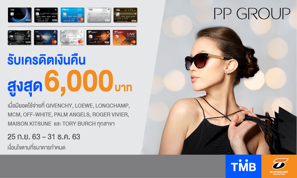 ต่อที่ 1 เมื่อมียอดใช้จ่าย 15,000 บาท ขึ้นไป/เซลล์สลิป รับเครดิตเงินคืน 300 บาท ยอดใช้จ่าย 40,000 บาทขึ้นไป/เซลล์สลิป รับเครดิตเงินคืน 1,000 บาท ยอดใช้จ่าย 100,000 บาทขึ้นไป/เซลล์สลิป รับเครดิตเงินคืน 3,000 บาท (เฉพาะรูดเต็มจำนวนเท่านั้น) บัตรเครดิตทีเอ็มบี ลงทะเบียนรับสิทธิ์ พิมพ์ TMBPG ตามด้วยหมายเลขบัตรเครดิต TMB 12 หลักสุดท้าย ส่งมาที่ 4806026 บัตรเครดิตธนชาต และบัตรเครดิตนครหลวงไทย พิมพ์ TPG ตามด้วยหมายเลขบัตรเครดิต 16 หลัก ส่งมาที่ 4712066 ต่อที่ 2 สำหรับลูกค้าบัตรเครดิตทีเอ็มบี รับสิทธิ์แบ่งจ่ายรายเดือน So GooOD ดอกเบี้ย 0% นาน 3 เดือน เมื่อมียอดขั้นต่ำ 1,000 บาท/เซลล์สลิป เพียงโทร. 1558 กด 1 ตามด้วย 01 หรือเลือกทำรายการด้วยตนเองผ่