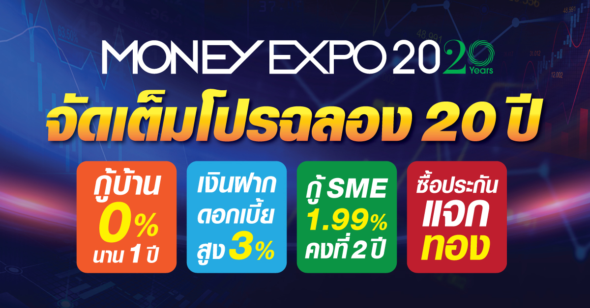 มิติหุ้น – งานมหกรรมการเงิน ครั้งที่ 20 Money Expo 2020 แบงก์/นอนแบงก์/ประกัน/บล,/บลจ. ร่วมฉลอง 20 ปี ทุ่มโปรโมชั่นพิเศษ สินเชื่อบ้านดอกเบี้ย 0% นาน 1 ปี เงินฝากดอกเบี้ยสูง 3% สินเชื่อ เอสเอ็มอี ดอกเบี้ยคงที่ 2 ปี 1.99% กู้ได้สูงสุด 100 ล้านบาท ทรัพย์ NPA ทำเลเด่น ลดสูงสุด 85% ซื้อประกัน รับฟรี! Gift Voucher 1 แสนบาท/iPhone11Pro/ทองคำแท่งหนัก 1 บาท Live สัมมนา “ครบเครื่องเรื่องการเงินการลงทุน” วันที่ 22-25 ต.ค. 2563 อาคารชาเลนเจอร์ 1-2 อิมแพ็ค เมืองทองธานี