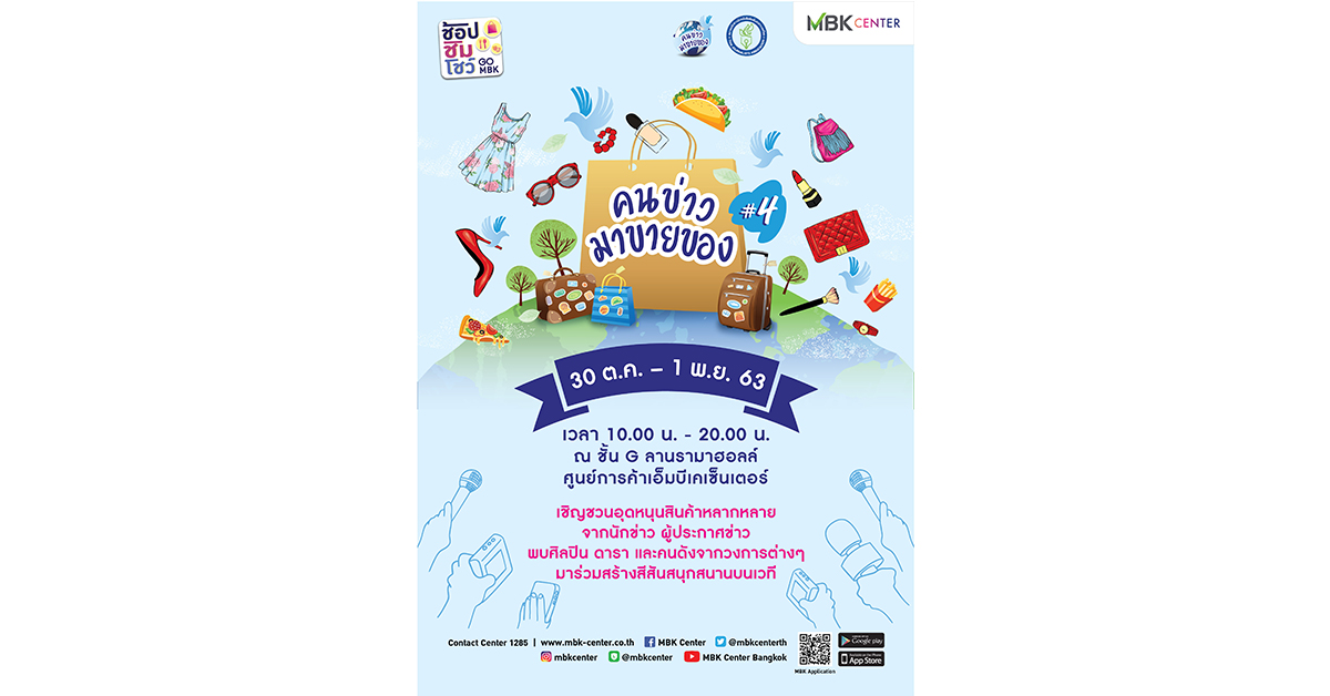 มิติหุ้น – เหล่านักช้อปเตรียมตัวให้พร้อม! ศูนย์การค้าเอ็ม บี เค เซ็นเตอร์ จับมือกับสมาคมนักข่าวนักหนังสือพิมพ์แห่งประเทศไทย จัดงาน “คนข่าวมาขายของ # 4” เพื่อเพิ่มช่องทางให้สื่อมวลชนในการสร้างรายได้ ภายในงานอัดแน่นด้วย บูธสินค้าของดีมีคุณภาพ ราคาสบายกระเป๋า ของเหล่านักข่าว ผู้ประกาศข่าวทั้งในอดีตและปัจจุบัน จัดเต็มด้วยศิลปิน ดารา คนดังจากวงการต่างๆ ที่แวะเวียนมาสร้างสีสันภายในงาน และอีกหนึ่งไฮไลท์พบกับทีมหมอดูชื่อดัง โหราศิษย์ฟันธง ลูกศิษย์ของ อ.ลักษณ์ ราชสีห์ โหรฟันธง นักโหราศาสตร์ชื่อดัง ที่จะมาร่วมออกบูธ เรียกว่ามาช้อปแล้วยังแวะเช็คดวงกันได้อีก โดยค่าดูดวงอยู่ที่ 299 บาท และจะหัก 50 บาท เพื่อนำไปสมทบเพื่อช่วยเหลือสื่อมวลชนที่ประสบวิกฤตการจ้างงานอีกด้วย