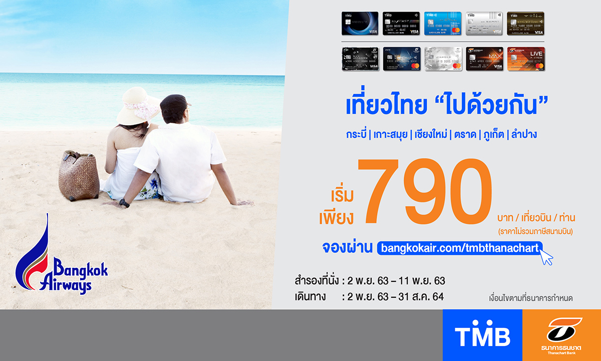 มิติหุ้น – บัตรเครดิตทีเอ็มบีและบัตรเครดิตธนชาต ร่วมกับ สายการบินบางกอกแอร์เวย์ส จัดโปรโมชั่น “เที่ยวนี้ บินได้เป็นคู่” ช่วยกระตุ้นการท่องเที่ยวในประเทศ มอบสิทธิพิเศษในการสำรองที่นั่งบัตรโดยสารให้แก่ลูกค้าในเส้นทางระหว่าง กรุงเทพฯ (สุวรรณภูมิ) และเชียงใหม่ ภูเก็ต กระบี่ และตราด เริ่มต้นเพียง 790 บาท/เที่ยวบิน/คน, เส้นทางระหว่าง กรุงเทพฯ (สุวรรณภูมิ) และลำปาง เริ่มต้นเพียง 1,050 บาท/เที่ยวบิน/คน, เส้นทางระหว่าง กรุงเทพฯ (สุวรรณภูมิ) และสมุย เริ่มต้นเพียง 1,890 บาท/เที่ยวบิน/คน (ราคายังไม่รวมภาษีสนามบิน) โดยสำรองที่นั่งได้ที่เว็บไซต์ www.bangkokair.com/tmbthanachart ตั้งแต่วันที่ 2-11 พฤศจิกายน 2563 และเดินทางได้ตั้งแต่ 2 พฤศจิกายน 2563 – 31 สิงหาคม 2564 สอบถามเส้นทาง เที่ยวบินและเงื่อนไขก่อนทำการสำรองที่นั่งที่สายการบินบางกอกแอร์เวย์ส โทร.1771 หรือ 0-2270-6699 หรือสอบถามรายละเอียดเพิ่มเติมที่ Contact Center โทร. 1558 สำหรับบัตรเครดิตทีเอ็มบี หรือ โทร. 1770 กด 0 กด 2 สำหรับบัตรเครดิตธนชาต