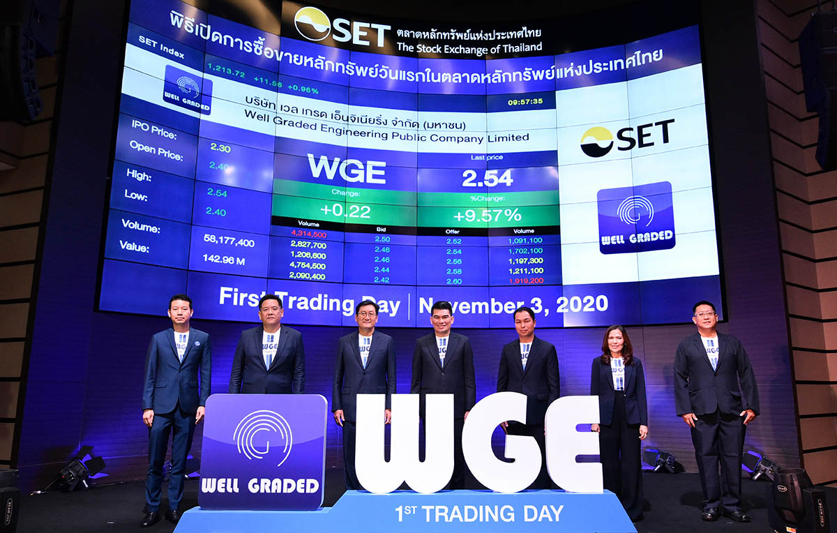 มิติหุ้น – ดร.ภากร ปีตธวัชชัย กรรมการและผู้จัดการ ตลาดหลักทรัพย์แห่งประเทศไทย พร้อมด้วย คุณแมนพงศ์ เสนาณรงค์ รองผู้จัดการ หัวหน้าสายงานผู้ออกหลักทรัพย์ ตลาดหลักทรัพย์แห่งประเทศไทย (SET) คุณสัมฤทธิ์ชัย ตั้งหะรัฐ กรรมการผู้จัดการ บริษัท คันทรี่ กรุ๊ป แอ๊ดไวเซอรี่ จำกัด , ดร.วีรพัฒน์ เพชรคุปต์ ประธานเจ้าหน้าที่บริหาร บริษัทหลักทรัพย์ คันทรี่ กรุ๊ป จำกัด (มหาชน) ร่วมแสดงความยินดีกับ คุณเกรียงศักดิ์ บัวนุ่ม ประธานกรรมการบริหาร บริษัท เวล เกรด เอ็นจิเนียริ่ง จำกัด (มหาชน) หรือ WGE เนื่องในโอกาสที่ WGE เข้าทำการซื้อขายในตลาดหลักทรั