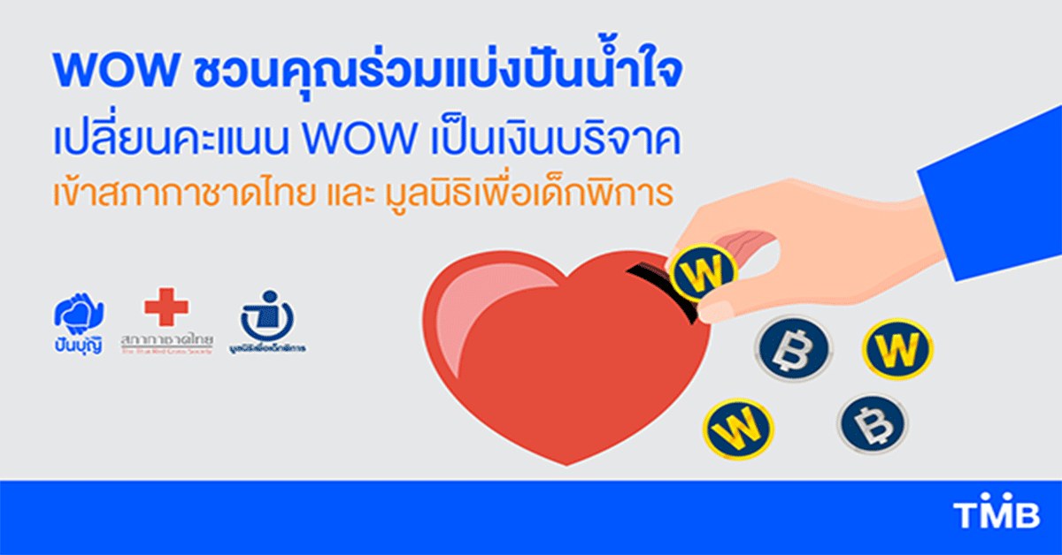 มิติหุ้น-ทีเอ็มบี ขอเชิญส่งต่อรอยยิ้มและน้ำใจให้สังคม ด้วยลอยัลตี้โปรแกรม WOW ซึ่งเป็นโปรแกรมสะสมคะแนนที่เกิดจากการทำธุรกรรมกับทีเอ็มบี เพื่อนำคะแนนดังกล่าวไปใช้แทนเงินสด (1 WOW = 1 บาท) หรือแลกของรางวัลสุดคุ้มผ่านแอปพลิเคชัน TOUCH และเพื่อเป็นการมอบน้ำใจให้กับสังคม ลูกค้าสามารถเปลี่ยนคะแนน WOW ของตัวเองให้มีความหมายมากขึ้น โดยใช้คะแนน 20 WOW เพื่อแลกเป็นเงินบริจาค 20 บาท สมทบทุนให้สภากาชาดไทย หรือมูลนิธิเพื่อเด็กพิการ ซึ่งสามารถบริจาคได้ไม่จำกัดจำนวนครั้ง ด้วยการทำรายการง่าย ๆ ที่เมนู WOW บนแอปพลิเคชัน TOUCH จากนั้นเงินบริจาคจะส่งผ่านทาง “ปันบุญ หรือ www.punboon.org ซึ่งเป็นช่องทางบริจาคออนไลน์เพื่อส่งต่อไปยังสภากาชาดไทยและมูลนิธิเพื่อเด็กพิการ เริ่มบริจาคได้ตั้งแต่วันนี้ – 31 ธันวาคม 2563 สอบถามรายละเอียดเพิ่มเติมที่ Contact Center 1558