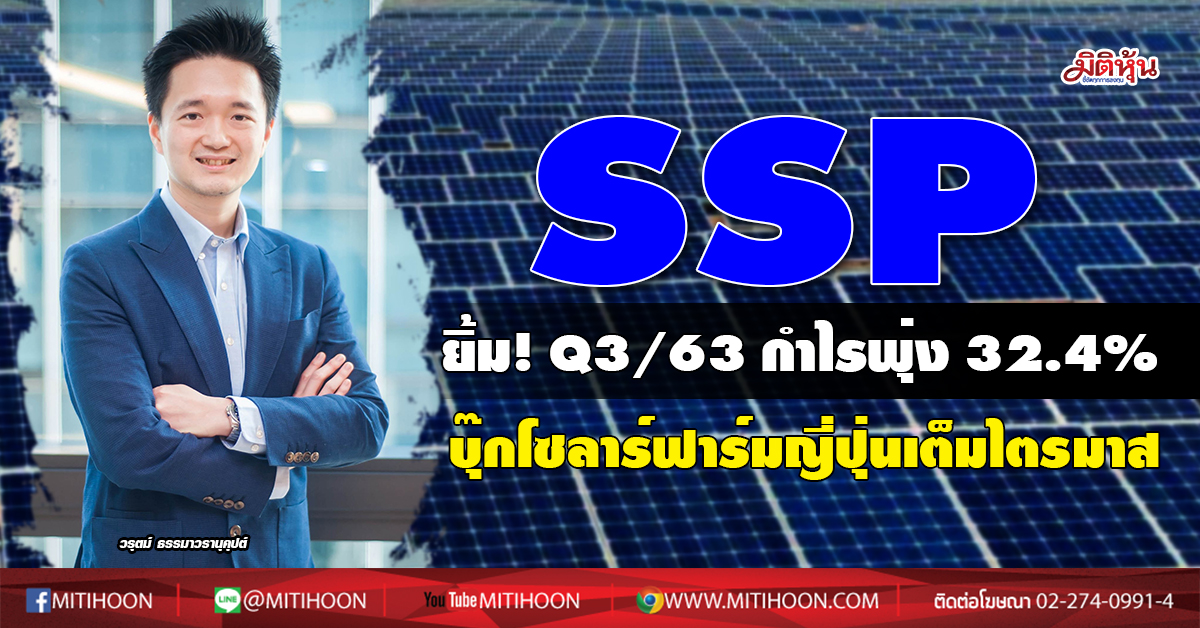 มิติหุ้น – SSP โชว์กำไรจากการดำเนินงานไตรมาส 3/63 เพิ่มขึ้น 32.4% จากงวดเดียวกันปีก่อนแตะ 205.2 ล้านบาท ขณะที่กำไรสุทธิเพิ่มขึ้น 58.0% แตะ 227.5 ล้านบาท เนื่องจากรับรู้รายได้เต็มไตรมาสจากโรงไฟฟ้าโซลาร์ฟาร์มในโครงการ Yamaga ขนาด 30 MW หลัง COD ได้ก่อนกำหนด ฟาก ” วรุตม์ ธรรมาวรานุคุปต์ ” ประธานเจ้าหน้าที่บริหาร มั่นใจกำลังการผลิตกระแสไฟฟ้าเพิ่มขึ้นเป็น 142 MW ดันผลงานปีนี้ทุบสถิตินิวไฮ พร้อมเดินหน้าลงทุนโครงการใหม่ หนุนอนาคตสดใส