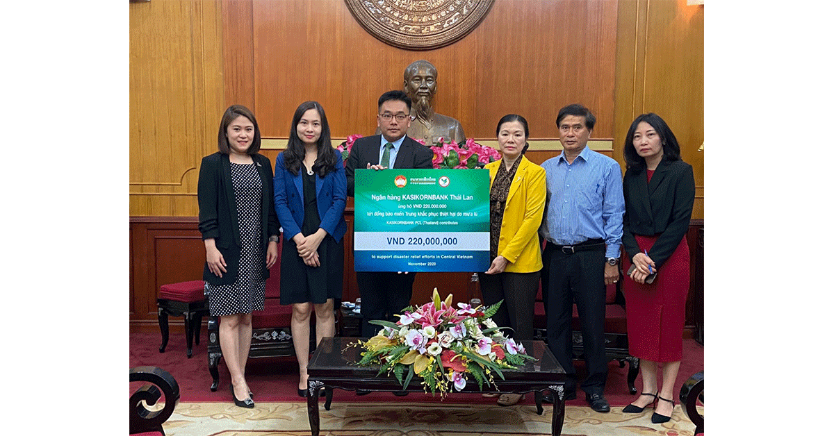 มิิติหุ้น-นายสิทธิพัฒน์ จริยากูล (ที่ 3 จากซ้าย) หัวหน้าสำนักงานผู้แทนฯ ธนาคารกสิกรไทย ณ กรุงฮานอย เป็นผู้แทนของธนาคารเข้ามอบเงินบริจาค จำนวน 220 ล้านดอง หรือประมาณ 300,000 บาท ให้แก่ Ms. Truong Thi Ngoc Anh (ที่ 3 จากขวา) รองประธานคณะกรรมการกลางแนวร่วมปิตุภูมิเวียดนาม เพื่อช่วยเหลือและบรรเทาความเดือดร้อนให้แก่ผู้ประสบอุทกภัยและดินถล่มในภาคกลางของเวียดนาม และเป็นกำลังใจให้เวียดนามสามารถฟื้นฟูแก้ไขจากเหตุภัยพิบัตินี้ได้โดยเร็ว ณ สำนักงานแนวร่วมปิตุภูมิเวียดนาม (กรุงฮานอย) เมื่อเร็ว ๆ นี้