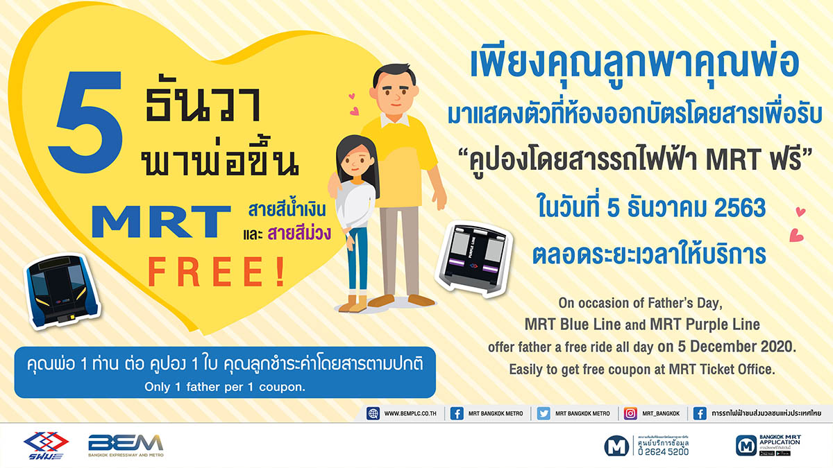 มิติหุ้น – การรถไฟฟ้าขนส่งมวลชนแห่งประเทศไทย (รฟม.) และ บริษัท ทางด่วนและรถไฟฟ้ากรุงเทพ จำกัด (มหาชน) หรือ BEM จัดกิจกรรม “5 ธันวา พาพ่อขึ้น MRT สายสีน้ำเงินและสายสีม่วงฟรี” เนื่องในวันพ่อแห่งชาติ 5 ธันวาคม 2563 ซึ่งเป็นวันคล้ายวันพระบรมราชสมภพพระบาทสมเด็จพระบรมชนกาธิเบศร มหาภูมิพลอดุลยเดชมหาราช บรมนาถบพิตร เพื่อส่งเสริมความสัมพันธ์ในครอบครัว ในการเดินทางท่องเที่ยวด้วยรถไฟฟ้า พร้อมร่วมรณรงค์ประหยัดพลังงานด้วยการใช้ระบบขนส่งสาธารณะ เพียงคุณลูกพาคุณพ่อมาแสดงตัวและรับคูปองโดยสารรถไฟฟ้า MRT ฟรี ที่ห้องออกบัตรโดยสารรถไฟฟ้า MRT สายเฉลิมรัชมงคล (สายสีน้ำเงิน) และรถไฟฟ้า MRT สายฉลองรัชธรรม (สายสีม่วง) ตลอดระยะเวลาให้บริการ สำหรับคุณลูกชำระค่าโดยสารตามปกติสอบถามรายละเอียดเพิ่มเติมได้ที่ศูนย์บริการข้อมูลโทร. 0–2624–5200 หรือติดตามทางช่องทางต่างๆ ได้ที่ เฟซบุ๊ก: MRT Bangkok Metro / ทวิตเตอร์: MRT Bangkok Metro / อินสตาแกรม: mrt_bangkok และ โมบายแอปพลิเคชัน: Bangkok MRT “เดินทางปลอดภัย สะดวก รวดเร็ว ด้วยรถไฟฟ้า MRT”