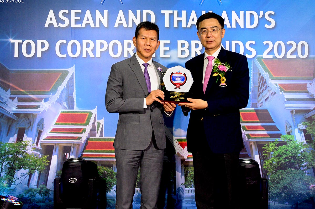 มิติหุ้น – นายระเฑียร ศรีมงคล (ซ้าย) ประธานเจ้าหน้าที่บริหาร “เคทีซี” หรือ บริษัท บัตรกรุงไทย จำกัด (มหาชน) ขึ้นรับมอบรางวัลมูลค่าแบรนด์องค์กรสูงสุดในหมวดธุรกิจการเงิน ประจำปี 2563 “Thailand’s Top Corporate Brand Value 2020” จากศาสตราจารย์ ดร.บัณฑิต เอื้ออาภรณ์ (ขวา) อธิการบดี จุฬาลงกรณ์มหาวิทยาลัย ด้วยมูลค่าแบรนด์ 57,060 ล้านบาท ซึ่งนับเป็นปีที่ 4 ที่เคทีซีได้รับรางวัลดังกล่าว ในงาน ASEAN and Thailand’s Top Corporate Brands 2020 ณ อาคารมหาจุฬาลงกรณ์ จุฬาลงกรณ์มหาวิทยาลัย