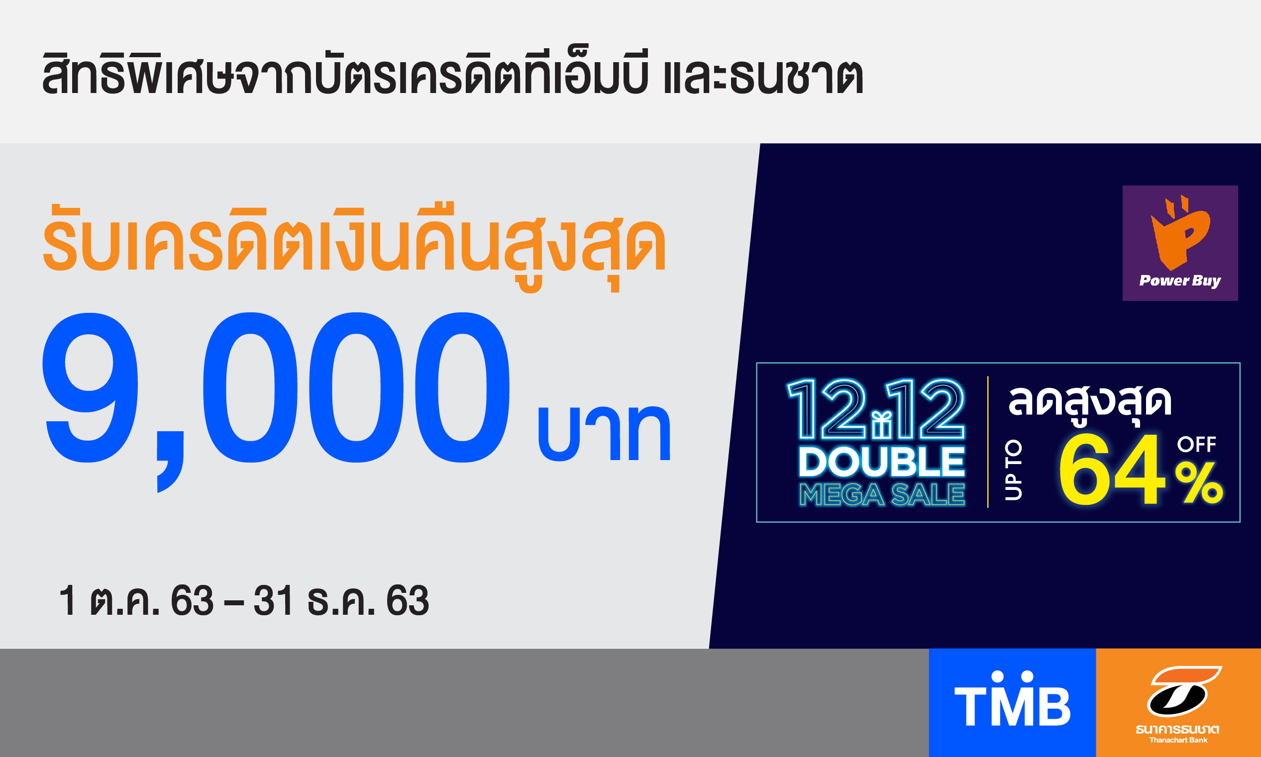 บัตรเครดิตทีเอ็มบีและบัตรเครดิตธนชาต มอบสิทธิพิเศษที่คุ้มยิ่งขึ้นเมื่อช้อปออนไลน์ที่เพาเวอร์บาย (Power Buy) ผ่านเว็บไซต์ www.powerbuy.co.th รับเครดิตเงินคืนสูงสุด 9,000 บาท โดยเมื่อมียอดใช้จ่าย 5,000 – 14,999 บาท/เซลล์สลิป รับเครดิตเงินคืน 100 บาท, ยอดใช้จ่าย 15,000 – 29,999 บาท/เซลล์สลิป รับเครดิตเงินคืน 350 บาท, ยอดใช้จ่าย 30,000 – 49,999 บาท/เซลล์สลิป รับเครดิตเงินคืน 750 บาท และยอดใช้จ่าย 50,000 บาทขึ้นไป/เซลล์สลิป รับเครดิตเงินคืน 1,500 บาท โดยจำกัดรับเครดิตเงินคืนสูงสุด 9,000 บาท/1 บัญชีลูกค้า (คำนวณรวมบัตรหลักทุกใบ และบัตรเสริม) ตลอดรายการ/ธนาคาร โปรโมชันเริ่มตั้งแต่วันนี้ถึง 31 ธันวาคม 2563 เพียงลงทะเบียน SMS โดยบัตรเครดิตทีเอ็มบี พิมพ์ PWO ตามด้วยหมายเลขบัตรเครดิต 12 หลักสุดท้าย ส่งมาที่ 4806026 บัตรเครดิตธนชาต และบัตรเครดิตนครหลวงไทย พิมพ์ PWO ตามด้วยหมายเลขบัตรเครดิต 16 หลัก ส่งมาที่ 4712066 สอบถามรายละเอียดเพิ่มเติมที่ Contact Center โทร. 1558 สำหรับบัตรเครดิตทีเอ็มบี และ โทร. 1770 สำหรับบัตรเครดิตธนชาต