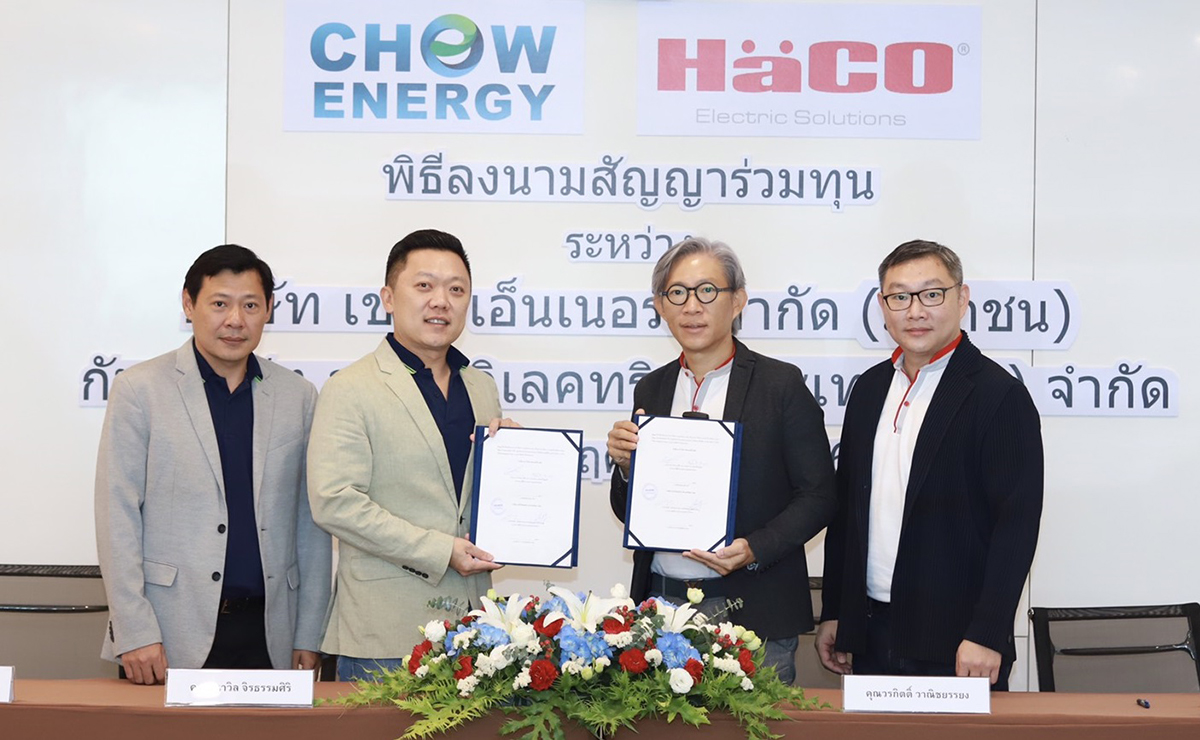 มิติหุ้น – นายอนาวิล จิรธรรมศิริ (ที่ 2 จากซ้าย) ประธานกรรมการบริหาร บริษัท เชาว์ สตีล อินดัสทรี้ จำกัด (มหาชน) หรือ CHOW ผู้ประกอบธุรกิจผลิตและจำหน่ายผลิตภัณฑ์เหล็กแท่งยาว (Steel Billet) รายใหญ่ของประเทศ และธุรกิจพลังงานทดแทนประเภทพลังงานแสงอาทิตย์ พร้อมด้วย นายธนชาต เผ่าพงษ์ไพบูลย์ (ซ้าย) ประธานเจ้าหน้าที่ฝ่ายปฏิบัติการ บริษัท เชาว์ เอ็นเนอร์ยี่ จำกัด (มหาชน) ลงนามในสัญญาร่วมกับ นายวรกิตติ์ วาณิชยรรยง (ที่ 2 จากขวา) ประธานเจ้าหน้าที่บริหาร บริษัท ฮาโก้ อิเลคทริค (ประเทศไทย) จำกัด ผู้จัดจำหน่ายอุปกรณ์ไฟฟ้าครบวงจร และนายทัสสพันธ์ วาณิชยรรยง (ขวา) ประธานเจ้าหน้าที่ฝ่ายการตลาด จัดตั้งบริษัท เชาว์ แอนด์ ฮาโก้ โซลาร์ จำกัด ขยายธุรกิจรับเหมาติดตั้งระบบผลิตพลังงานแสงอาทิตย์บนหลังคา (Solar Rooftop) ร่วมกัน ณ บริษัท เชาว์ สตีล อินดัสทรี้ จำกัด (มหาชน) สำนักงานใหญ่ อาคารเอฟวายไอ เซ็นเตอร์2 คลองเตย เมื่อเร็ว ๆ นี้
