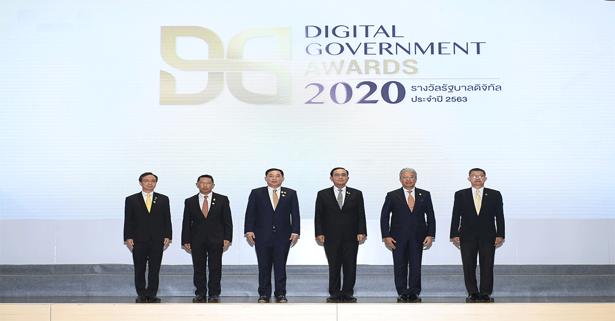 มิติหุ้น-พลเอก ประยุทธ์ จันทร์โอชา (ที่ 4 จากซ้าย) นายกรัฐมนตรี ให้เกียรติเป็นประธานมอบรางวัล Digital Government Awards 2020 (รางวัลรัฐบาลดิจิทัลประจำปี 2563) จัดขึ้นโดย สำนักงานพัฒนารัฐบาลดิจิทัล (องค์การมหาชน) สพร. หรือ DGA พร้อมด้วย นายอนุชา นาคาศัย (ที่ 3 จากซ้าย) รัฐมนตรีประจำสำนักนายกรัฐมนตรี นายดิสทัต โหตระกิตย์ ( ที่ 5 จากซ้าย) เลขาธิการนายกรัฐมนตรี นายสุพจน์ เธียรวุฒิ (ที่ 1 จากซ้าย) ผู้อำนวยการสำนักพัฒนารัฐบาลดิจิทัล นายอารีพงศ์ ภู่ชอุ่ม (ที่ 2 จากซ้าย) ประธานกรรมการสำนักงานพัฒนารัฐบาลดิจิทัล และ นายธีรภัทร ประยูรสิทธิ (ที่ 6 จากซ้าย) ปลัดสำนักนายกรัฐมนตรี ร่วมแสดงความยินดีกับหน่วยงานภาครัฐที่ได้รับรางวัลรัฐบาลดิจิทัลประจำปี 2563 โดยมีระดับกรม 10 รางวัล และระดับจังหวัด 5 รางวัล พร้อมรางวัลหน่วยงานดีเด่นด้านการใช้ธรรมาภิบาลข้อมูลภาครัฐ (Data Governance) 3 รางวัล รางวัลหน่วยงานดีเด่นด้านการเปิดเผยข้อมูลผ่านศูนย์กลางข้อมูลเปิดภาครัฐ (Data.go.th) 5 รางวัล และรางวัลผู้นำองค์กรดิจิทัลดีเด่น 2020 1 รางวัล ณ สโมสรทหารบก วิภาวดี กรุงเทพฯ เมื่อเร็วๆ นี้