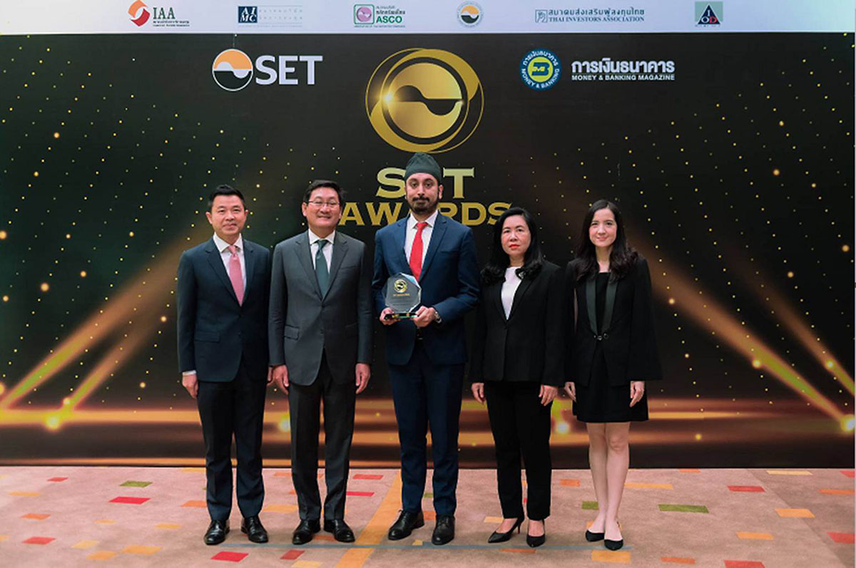มิติหุ้น – นายธนโชติ รุ่งสิทธิวัฒน์ รองกรรมการผู้จัดการ พร้อมด้วยคณะผู้บริหาร คุณพัณณรัชต์ บรรพโต และคุณชาคริต พืชพันธ์ ผู้ช่วยกรรมการผู้จัดการอาวุโส บริษัทหลักทรัพย์จัดการกองทุน เอ็มเอฟซี จำกัด (มหาชน) ร่วมรับรางวัลเกียรติยศจากงาน “SET AWARDS 2020” ประเภทบริษัทจดทะเบียนด้านผลการดำเนินงานดีเด่น ( Outstanding Company Performance Awards) กลุ่มบริษัทจดทะเบียนฯที่มีมูลค่าหลักทรัพย์ตามราคาตลาดไม่เกิน 3,000 ล้านบาท โดยมีนายภากร ปีตธวัชชัย กรรมการและผู้จัดการ ตลาดหลักทรัพย์แห่งประเทศไทย และนางสาว ภาคนี วิริยะรังสฤษฎ์ บรรณาธิการอำนวยการ วารสารการเงินธนาคาร ร่วมแสดงความยินดี เมื่อวันที่ 15 ธันวาคม 2563 ที่ผ่านมา ณ ตลาดหลักทรัพย์แห่งประเทศไทย