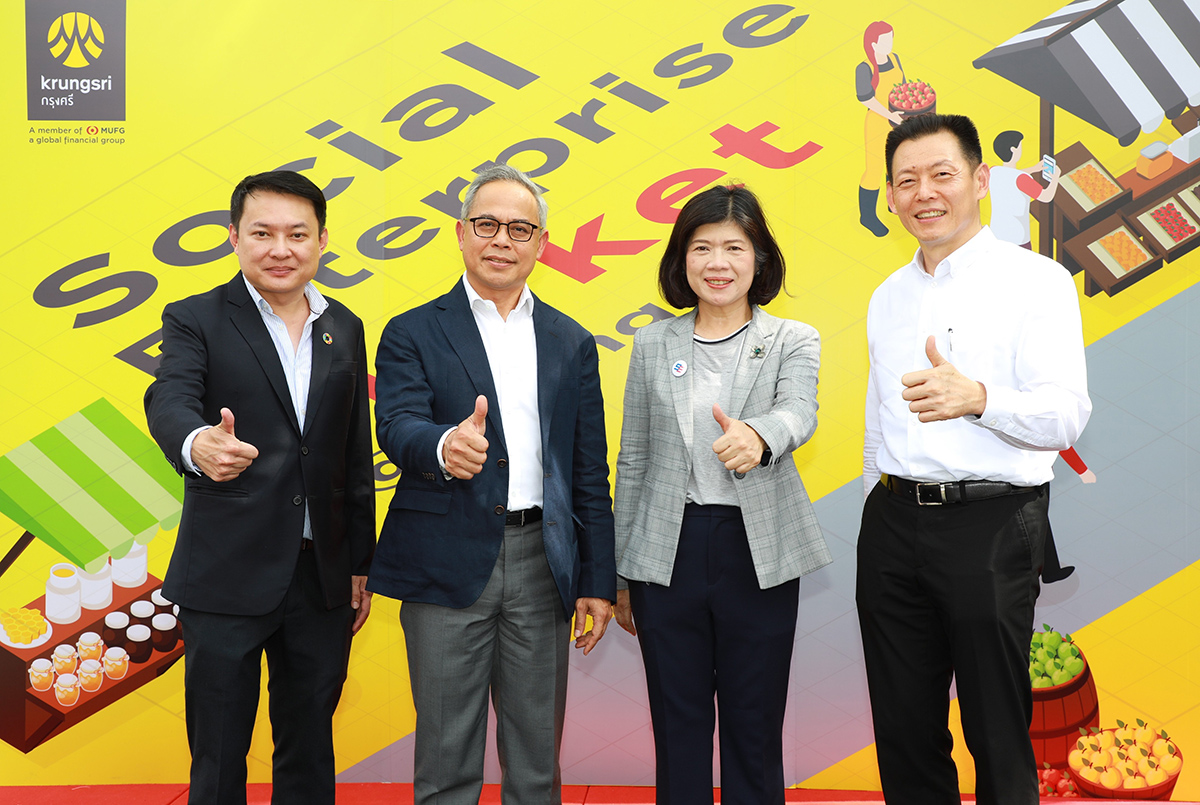 มิติหุ้น — นายไพโรจน์ ชื่นครุฑ (ที่ 2 จากซ้าย) ประธานคณะเจ้าหน้าที่ด้านกลยุทธ์และวางแผนธุรกิจองค์กร ธนาคารกรุงศรีอยุธยา จำกัด (มหาชน) และนางเกศรา มัญชุศรี (ที่ 3 จากซ้าย) กรรมการผู้ทรงคุณวุฒิ สมาคมธุรกิจเพื่อสังคม (SE Thailand) เปิดงาน Social Enterprise Market @Krungsri ที่กรุงศรีและ SE Thailand ร่วมกันจัดขึ้นเพื่อสร้างโอกาสและสนับสนุนให้วิสาหกิจเพื่อสังคมที่ได้รับผลกระทบจากวิกฤตโควิด-19 ให้สามารถเดินหน้าต่อไปได้ โดยในงานมีสินค้าและผลิตภัณฑ์คุณภาพที่คำนึงถึงสังคมและสิ่งแวดล้อมจากหลากหลายวิสาหกิจชั้นนำอาทิ ดอยตุง ดอยคำ กรีนเนท รวมถึงศูนย์ศิลปาชีพระหว่างประเทศ พร้อมกิจกรรมสนุกๆ ต้อนรับเทศกาลแบ่งปันความสุขที่กำลังจะมาถึง