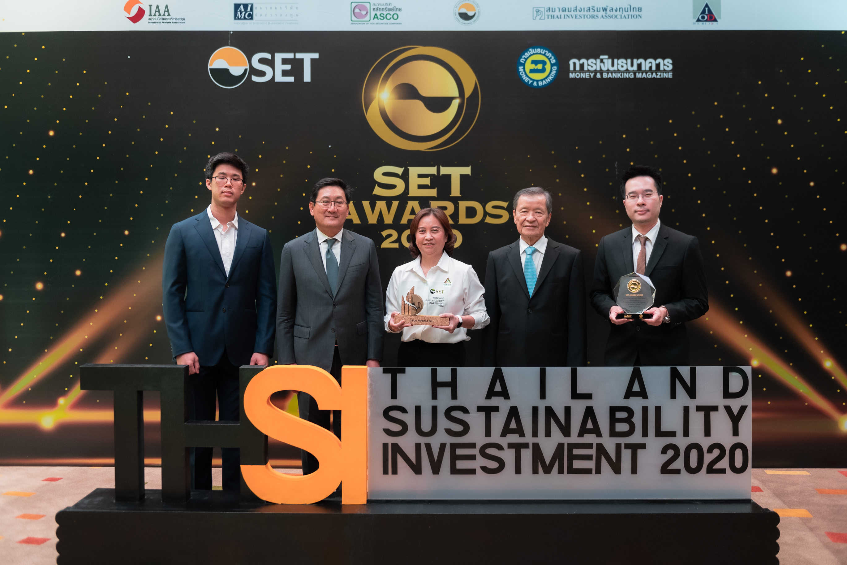 และรางวัล “หุ้นยั่งยืน” หรือ “Thailand Sustainability Investment (THSI)” ประจำปี 2563 เป็นปีที่สองติดต่อกัน จากจำนวน 124 บริษัท โดยเป็นรางวัลที่มอบให้แก่บริษัทจดทะเบียนที่มีการดำเนินธุรกิจอย่างยั่งยืนโดยคำนึงถึงสิ่งแวดล้อม มีความรับผิดชอบต่อสังคม และมีการบริหารงานตามหลักบรรษัทภิบาล (Environmental, Social and Governance หรือ ESG) โดยได้รับเกียรติจาก ดร.ภากร ปีตธวัชชัย (ที่ 2 จากซ้าย) กรรมการและผู้จัดการ ตลาดหลักทรัพย์แห่งประเทศไทย และนายสันติ วิริยะรังสฤษฎ์ (ที่ 2 จากขวา) ประธานบรรณาธิการวารสารการเงินธนาคาร ร่วมถ่ายภาพเป็นที่ระลึก ณ หอประชุมศุกรีย์ แก้วเจริญ ชั้น 3 อาคารตลาดหลักทรัพย์แห่งประเทศไทย เมื่อเร็วๆ นี้