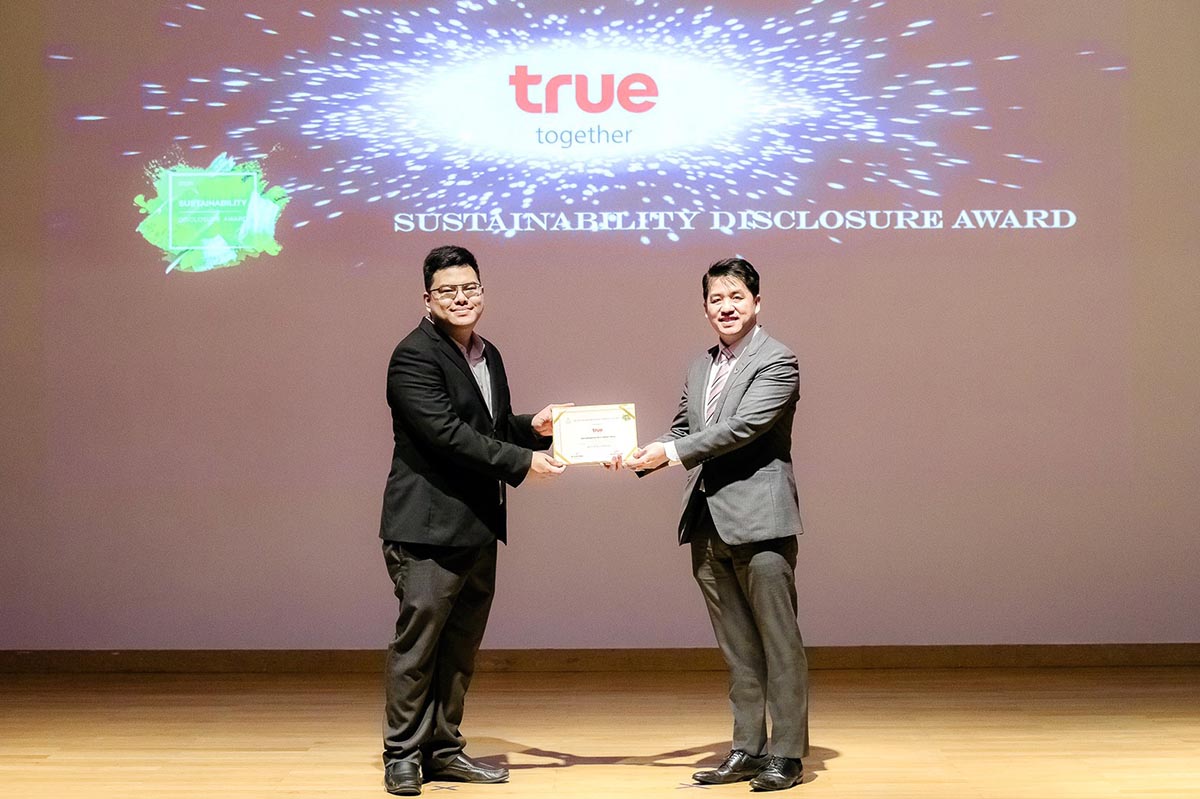 มิติหุ้น – สถาบันไทยพัฒน์ โดย นายวรณัฐ เพียรธรรม ผู้อำนวยการสถาบันมอบรางวัลเกียรติคุณ Sustainability Disclosure Award ประจำปี 2563 ซึ่งเป็นรางวัลระดับสูงสุดแก่ กลุ่มทรู โดย ดร.ธีระพล ถนอมศักดิ์ยุทธ หัวหน้าคณะผู้บริหารด้านนวัตกรรมและความยั่งยืน เป็นตัวแทนรับมอบ ในงาน“The State of Corporate Sustainability in 2020” ซึ่งกลุ่มทรู เป็นองค์กรสื่อสารโทรคมนาคมไทยเพียงรายเดียวที่ได้รับรางวัลสูงสุดนี้ต่อเนื่องเป็นปีที่ 2 ในฐานะองค์กรตัวอย่างที่มีการเปิดเผยข้อมูลด้านความยั่งยืนที่ครบถ้วน น่าเชื่อถือ และมีการสื่อสารต่อสาธารณะและผู้มีส่วนได้ส่วนเสียที่เกี่ยวข้องอย่างต่อเนื่อง สะท้อนการดำเนินธุรกิจของบริษัทที่มีการกำกับดูแลกิจการที่ดีและเปิดเผยข้อมูลอย่างโปร่งใส