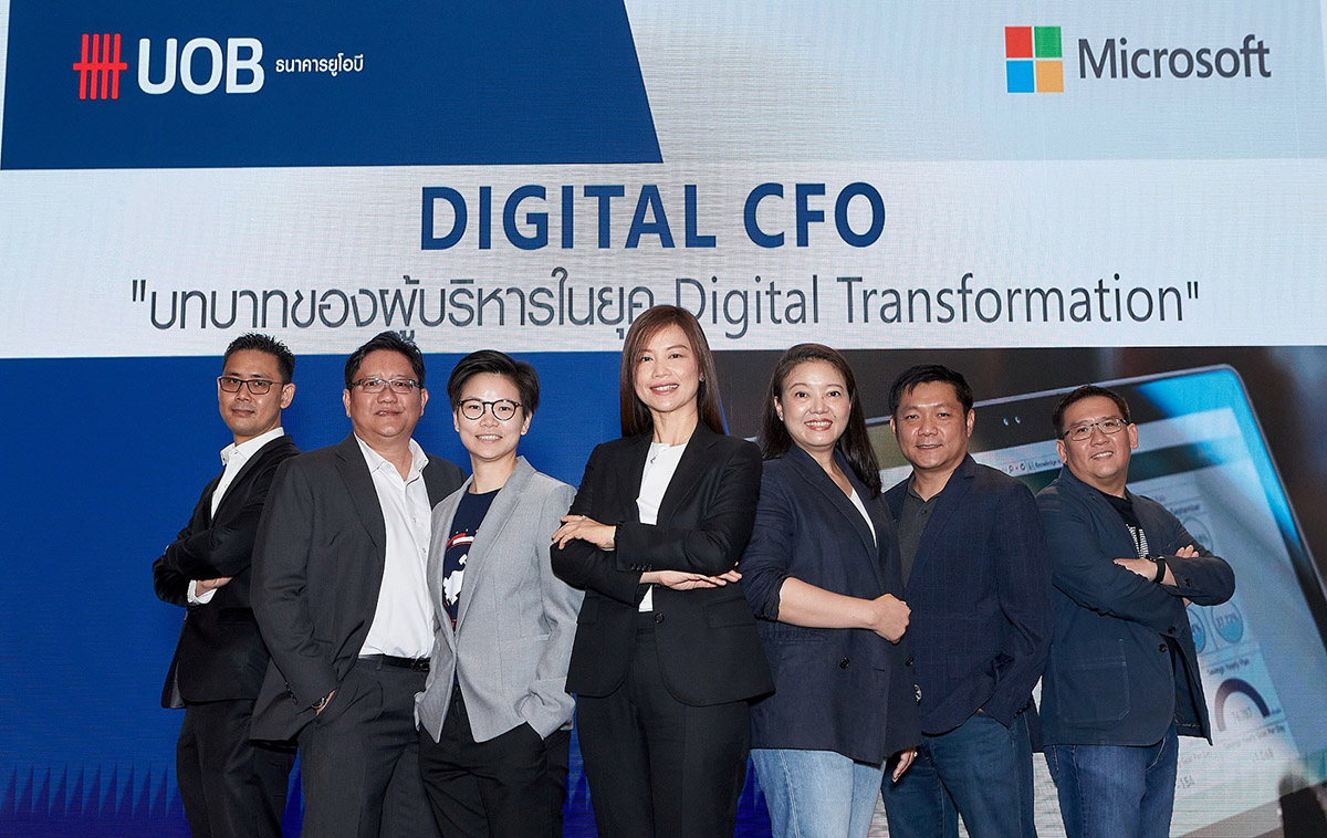 สิรินันท์ จิรดิลก ผู้อำนวยการอาวุโส Head of Digital Engagement & FinTech Innovation (ที่ 3 จากซ้าย) , เอกวิชญ์ คุมพ์ประพันธ์ ผู้อำนวยการอาวุโส Enterprise Banking Head-commercial banking (ที่ 1 จากซ้าย), และ พีระ จิตประไพ ผู้อำนวยการอาวุโส Head of cash management ธนาคารยูโอบี ประเทศไทย (ที่ 2 จากซ้าย) , คุณศรินทร พันธุ์โสภา ( ที่ 4 จากซ้าย) ผู้จัดการทั่วไป ของบริษัท เพอร์เฟ็ค เปเปอร์ จำกัด และสุภาณี อนุวงศ์วรเวทย์ รองกรรมการผู้จัดการ สายงานการเงิน บริษัท ไมโครซอฟท์ (ประเทศไทย) จำกัด (ที่ 3 จากขวา) ร่วมกันจัดงานสัมมนาถึงความสำคัญของ Digital Transformation ที่มีความชัดเจนมากขึ้นหลังโลกต้องเผชิญหน้ากับ COVID-19 ที่ผู้บริหารการเงินยุคใหม่จะต้องปรับตัว มองหาแนวทางดิจิทัลมาใช้ขับเคลื่อนธุรกิจให้ก้าวไปข้างหน้า