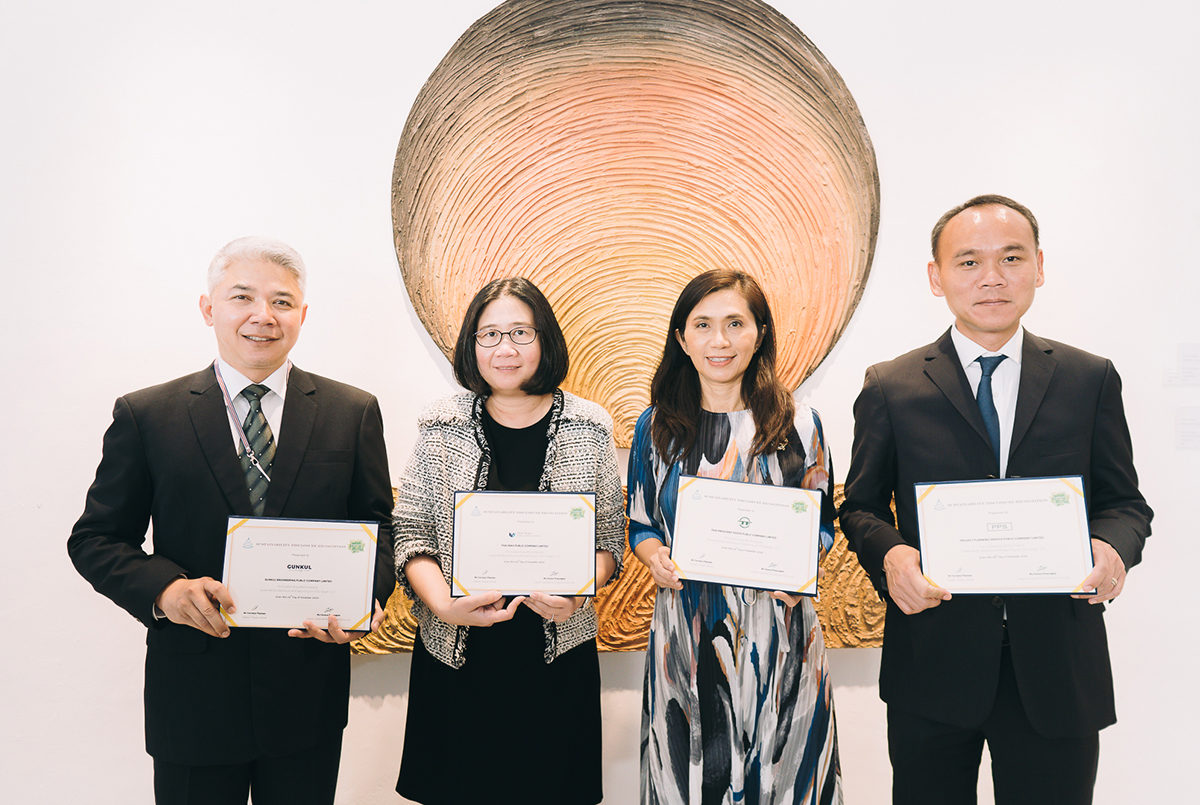มิติหุ้น – คุณอรอนงค์ วิชชุชาญ (กลาง) Group Chief Financial Officer และคุณรตินันทน์ วงศ์วัชรานนท์ (ขวา) Head of Corporate Communication and Sustainability บริษัท ไทยวา จำกัด (มหาชน) (TWPC) รับรางวัลประกาศเกียรติคุณ “Sustainability Disclosure Award” ต่อเนื่องเป็นปีที่ 2 สะท้อนการดำเนินธุรกิจที่มีการกำกับดูแลกิจการที่ดีและพร้อมพัฒนาธุรกิจสู่การพัฒนาอย่างยั่งยืน จากคุณวรณัฐ เพียรธรรม (ซ้าย) ผู้อำนวยการ สถาบันไทยพัฒน์ ในงาน “The State of Corporate Sustainability in 2020” จัดโดยสถาบันไทยพัฒน์ เพื่อส่งเสริมให้บริษัทจดทะเบียนและองค์กรที่เป็นสมาชิกของประชาคมการเปิดเผยข้อมูลความยั่งยืน (Sustainability Disclosure Community – SDC) ที่ประโยชน์ต่อกลุ่มผู้มีส่วนได้เสียของกิจการ รวมทั้งการตอบสนองต่อกลุ่มผู้มีส่วนได้เสียของกิจการและการพัฒนาองค์กรสู่ความยั่งยืนในระยะยาว ครอบคลุมในมิติการดำเนินงานด้านเศรษฐกิจ สังคม สิ่งแวดล้อม หรือ ESG (Environmental, Social and Governance) งานดังกล่าวจัดขึ้น ณ ห้องออดิทอเรียม ชั้น 5 หอศิลป์กรุงเทพฯ เมื่อเร็ว ๆ นี้