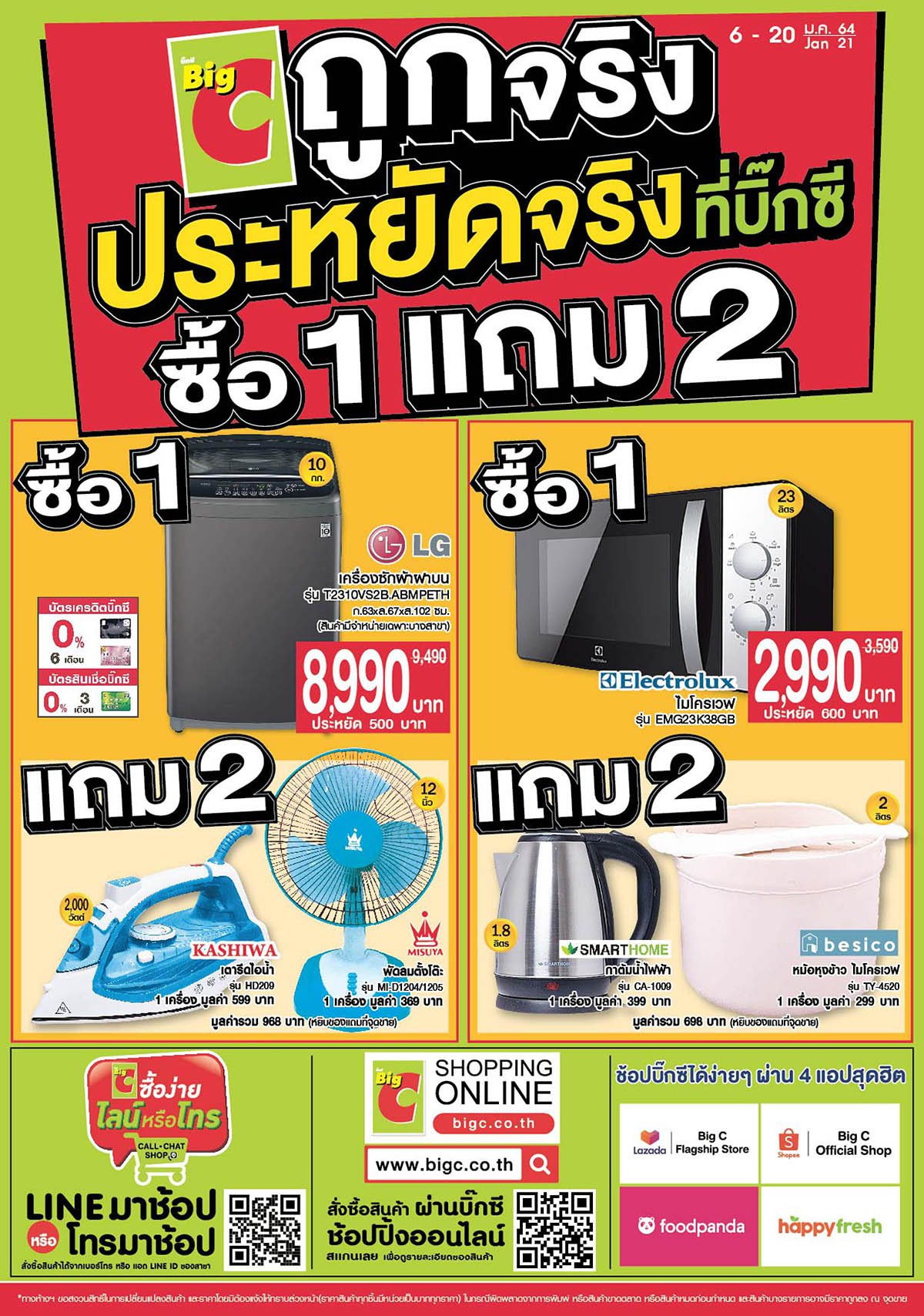 มิติหุ้น – “บิ๊กซี ซูเปอร์เซ็นเตอร์” ห้างคนไทยหัวใจคือลูกค้า มอบโปรโมชั่นสุดพิเศษต้อนรับปีใหม่ให้ทุกครอบครัว ระหว่างวันที่ 6-20 มกราคม 2564 ยกทัพสินค้ากว่า 1,000 รายการทุกหมวดหมู่ ตอกย้ำแคมเปญ “ถูกจริง ประหยัดจริงที่บิ๊กซี” ด้วยโปรโมชั่นสุดคุ้ม ซื้อ 1 แถม 2 เพื่อช่วยแบ่งเบาภาระค่าใช้จ่ายสินค้า บริการ และค่าครองชีพ ใช่ช่วงสถานการณ์การแพร่ระบาดของไวรัสโควิด-19 รอบใหม่ตลอดจนเพื่อเป็นของขวัญปีใหม่ให้กับลูกค้าบิ๊กซี อาทิ เครื่องซักผ้าฝาบน LG รุ่นT2310VS2B.ABMPETH ขนาด 10 กิโลกรัม ราคา 8,990 บาท แถมฟรี เตารีดไอน้ำ KASHIWA รุ่น HD209 1 เครื่อง มูลค่า 599 บาท และพัดลมตั้งโต๊ะ ขนาด 12 นิ้ว รุ่น MI-D1204/1205 1 เครื่อง มูลค่า 369 บาท, ไมโครเวฟ Electrolux รุ่น EMG23K38GB ขนาด 23 ลิตร ราคา 2,990 บาท แถมฟรี กาต้มน้ำไฟฟ้า SMARTHOME ขนาด 1.8 ลิตร รุ่น CA-1009 1 เครื่อง มูลค่า 399 บาท และหม้อหุงข้าว ไมโครเวฟ Besico ขนาด 2 ลิตร รุ่น TY-4520 1 เครื่อง มูลค่า 299 บาท, ชุดอเนกประสงค์ มาราธอน หม้อต้มพร้อมชั้นนึ่ง Seagull 3 ชิ้น ขนาด 24 ซม. ราคา 990 บาท/ชุด แถมฟรี กล่องอาหารแก้ว คละขนาด 2 ใบ รวมมูลค่า 158 บาท (หยิบของแถมที่จุดขาย คละแบบได้ ของแถมมีจำนวนจำกัดหมดแล้วหมดเลย)