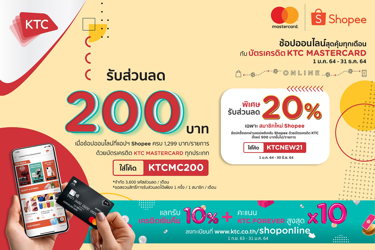 มิติหุ้น – นายณัฐสิทธิ์ สุนทราณู ผู้อำนวยการ – ธุรกิจบัตรเครดิต “เคทีซี” หรือ บริษัท บัตรกรุงไทย จำกัด (มหาชน) จัดแพ็คโปรโมชันสุดคุ้มเพื่อนักช้อปออนไลน์ผ่านแอปฯ Shopee โดยเฉพาะ สมาชิกบัตรเครดิตเคทีซี มาสเตอร์การ์ด รับส่วนลด 200 บาท เมื่อช้อปสินค้าครบ 1,299 บาทต่อรายการ และใส่โค้ด KTCMC200 ระหว่างวันที่ 1 มกราคม 2564 – 31 ธันวาคม 2564 (จำกัด 3,600 โค้ดส่วนลดต่อเดือน) สมาชิกบัตรเครดิตเคทีซีทุกประเภท (ยกเว้นยูเนี่ยนเพย์)รับส่วนลด 130 บาท ทุกวันจันทร์ เมื่อช้อปครบ 1,300 บาทต่อรายการ และใส่โค้ด KTCMONDAY ระหว่างวันที่ 4 มกราคม 2564 – 27 ธันวาคม 2564 รับเพิ่ม โค้ดส่วนลด Shopee มูลค่า 450 บาท เมื่อใช้ 1,999 คะแนน แลกผ่าน แอปฯ KTC Mobile (ปกติ 4,500 คะแนน) สำหรับช้อปสินค้าตั้งแต่ 1,999 บาทขึ้นไปต่อรายการ ไม่รวม ค่าจัดส่ง ระหว่างวันที่ 5 มกราคม 2564 – 31 มกราคม 2564 พิเศษ รับส่วนลด 20% สำหรับผู้ใช้งานใหม่และช้อปครั้งแรกผ่านแอปฯ Shopee ด้วยบัตรเครดิตเคทีซี ตั้งแต่ 500 บาทขึ้นไปต่อรายการ และใส่โค้ด “KTCNEW21” จำกัดส่วนลดสูงสุด 200 บาท ระหว่างวันที่ 1 มกราคม 2564 – 30 มิถุนายน 2564