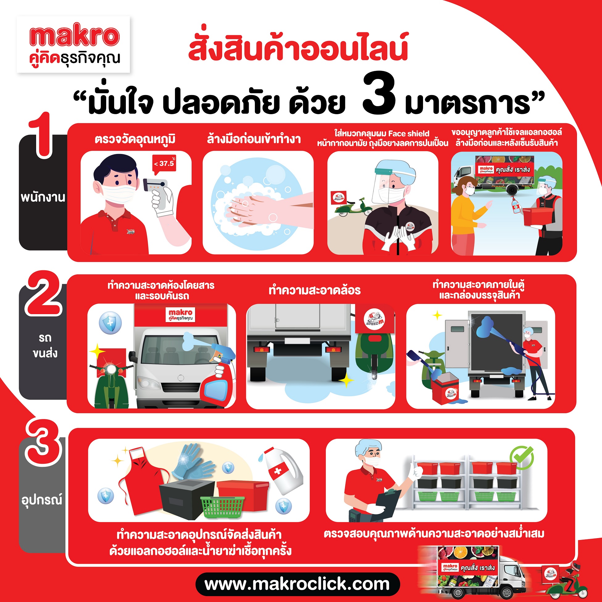 “แม็คโครให้ความสำคัญกับการดำเนินมาตรการป้องกันโควิด-19 อย่างเข้มข้น ตั้งแต่ต้นน้ำจนถึงปลายน้ำ ครอบคลุมถึงบริการดิลิเวอรี่ที่กำลังได้รับความนิยมจากลูกค้า เราเองได้ปฏิบัติตามแนวทางของกรมอนามัย กรมควบคุมโรค กระทรวงสาธารณสุขอย่างเคร่งครัด เพื่อให้ลูกค้ามั่นใจและเพื่อสุขอนามัยที่ดีของพนักงาน”