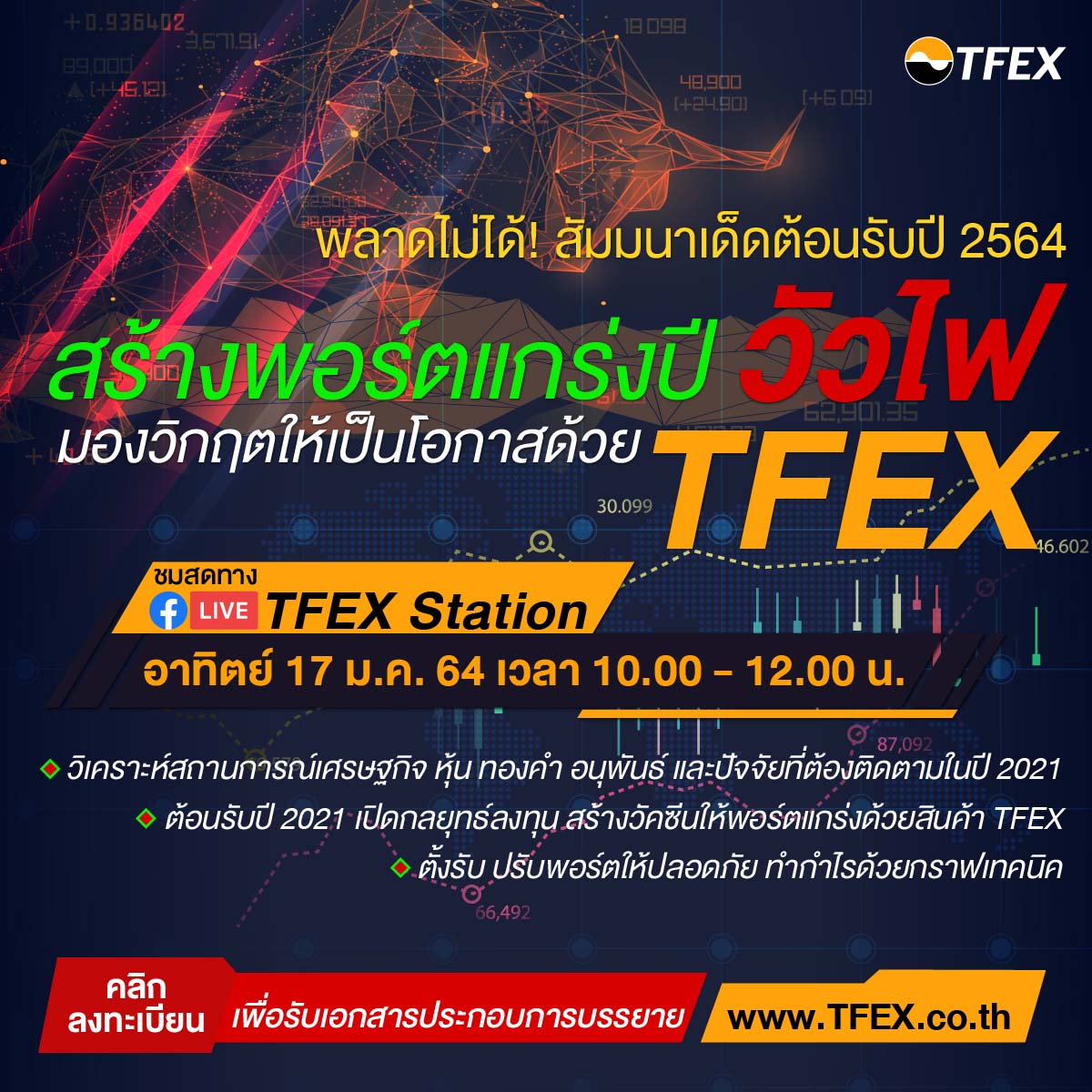 มิติหุ้น – บมจ. ตลาดสัญญาซื้อขายล่วงหน้า (ประเทศไทย) ชวนฟังสัมมนาเด็ดต้อนรับปี 2564 “สร้างพอร์ตแกร่งปีวัวไฟ มองวิกฤตให้เป็นโอกาสด้วย TFEX” อาทิตย์ที่ 17 ม.ค. นี้ 10.00-12.00 น. ผ่าน Facebook Live: TFEX Station เนื้อหาจัดเต็มโดยกูรูชั้นนำ ทั้งวิเคราะห์สถานการณ์เศรษฐกิจ หุ้น ทองคำ อนุพันธ์ และเปิดกลยุทธ์ลงทุนสร้างวัคซีน