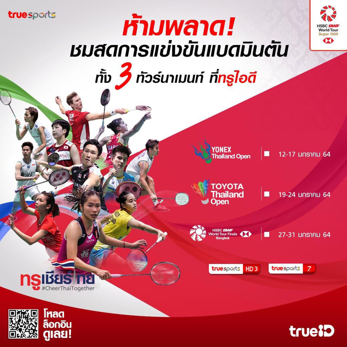 - และปิดท้ายด้วยศึก BWF World Tour Final 2020 ในวันที่ 27-31 ม.ค. 64ติดตามชมการชิงชัยของนักกีฬาแบดมินตันระดับโลก และร่วมส่งกำลังใจเชียร์นักกีฬาไทยคว้าชัยชนะในการแข่งขันครั้งนี้ไปด้วยกัน ได้ทางทรูไอดี ทั้งแอปฯ เว็บ และกล่องทรูไอดีทีวี สามารถดาวน์โหลดแอปทรูไอดี ได้ทั้ง App Store และ Play Storeติดตามชมการชิงชัยของนักกีฬาแบดมินตันระดับโลก และร่วมส่งกำลังใจเชียร์นักกีฬาไทยคว้าชัยชนะในการแข่งขันครั้งนี้ไปด้วยกัน ได้ทางทรูไอดี ทั้งแอปฯ เว็บ และกล่องทรูไอดีทีวี สามารถดาวน์โหลดแอปทรูไอดี ได้ทั้ง App Store และ Play Store