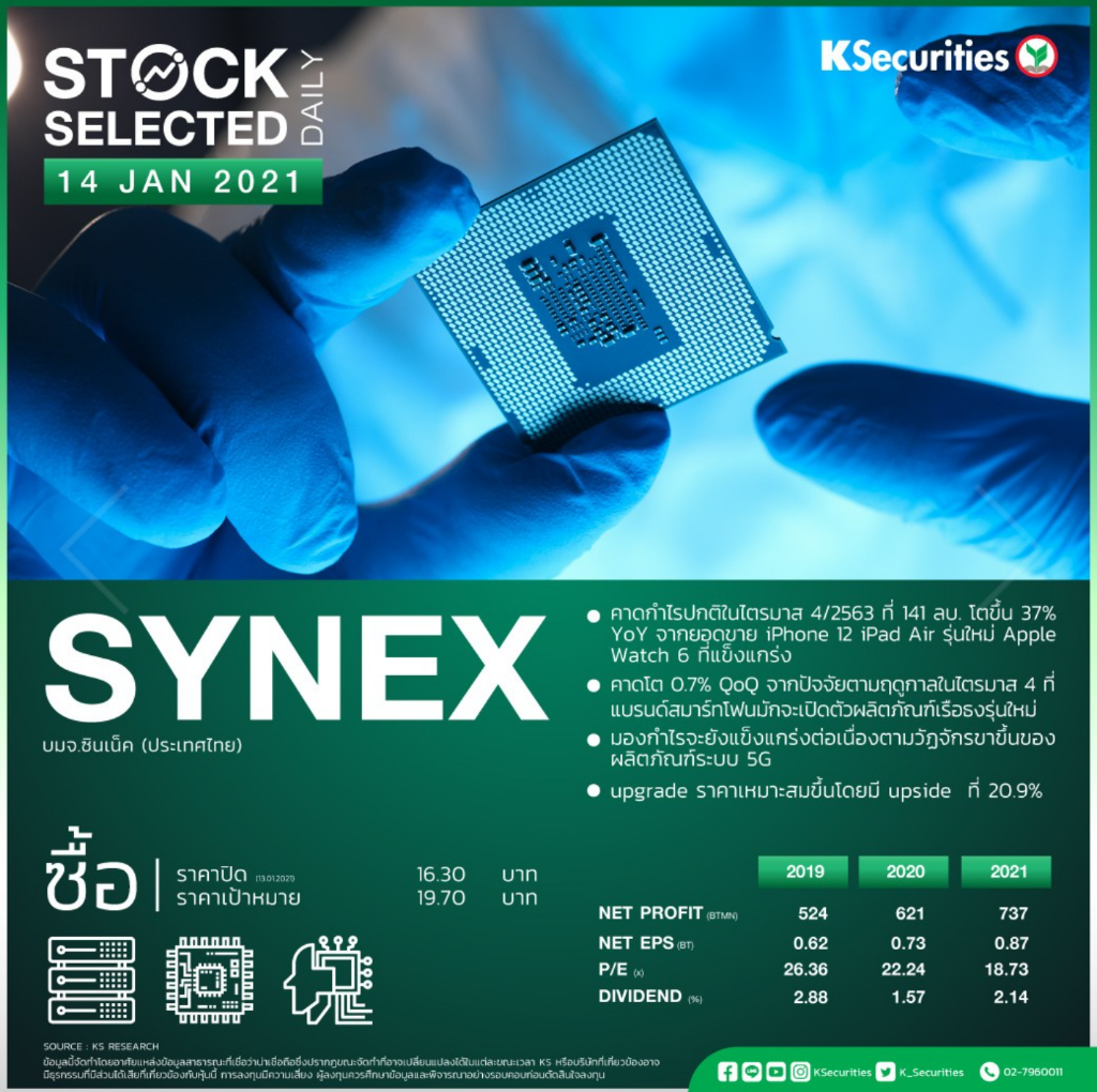 มิติหุ้น- บทวิเคราะห์ บล.กสิกรไทย ระบุว่า SYNEX ถูก upgrade ราคาเหมาะสม โดย มี upside ที่ 20.9% โดยคาดกำไรปกติในไตรมาส 4/2563 ที่ 141 ลบ. โต ขึ้น 37% YoY จากยอดขาย iPhone 12 iPad Air รุ่น ใหม่ Apple Watch 6 ที่แข็งแกร่ง
