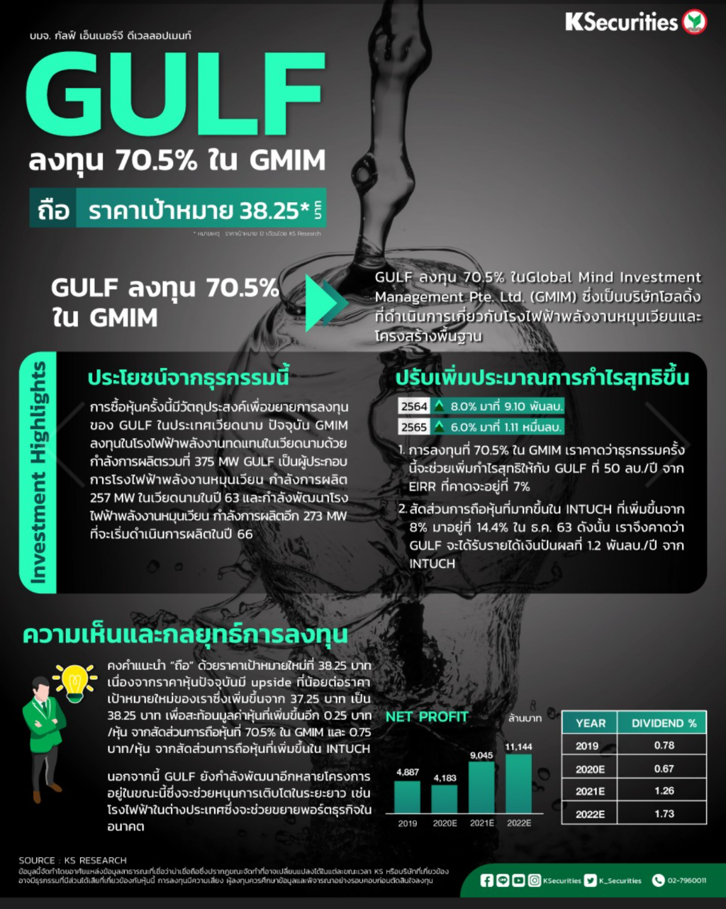 มิติหุ้น- บล.กสิกรไทยระบุว่า GULF ลงทุน 70.5% ใน Global Mind Investment Manag ement Pte. Ltd (GMIM) ซึ่งเป็นบริษัทโฮลดิ้งที่ดำเนินการ เกี่ยวกับโรงไฟฟ้าพลังงานหมุนเวียนและโครงสร้างพื้น ฐาน เราคาดว่าธุรกรรมครั้งนี้จะช่วยเพิ่มกำไรสุทธิให้ กับ GULF ที่ 50 ลบ./ปี จาก EIRR ที่คาดจะอยู่ที่ 7%