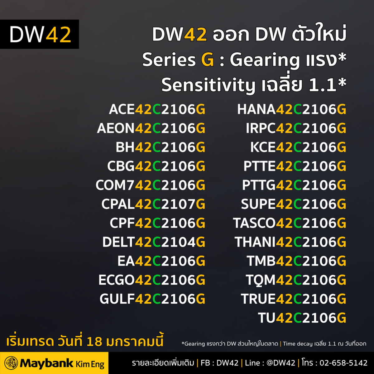 มิติหุ้น – บมจ.หลักทรัพย์ เมย์แบงก์ กิมเอ็ง (ประเทศไทย) เสนอขายใบสำคัญแสดงสิทธิอนุพันธ์ (Derivative Warrant :DW) SET50 Index DW จำนวน 23 ตัว ดังนี้ ACE42C2106G, AEON42C2106G, BH42C2106G, CBG42C2106G, COM742C2106G, CPAL42C2107G, CPF42C2106G, DELT42C2104G, EA42C2106G, EGCO42C2106G, GULF42C2106G, HANA42C2106G, IRPC42C2106G, KCE42C2106G, PTTE42C2106G, PTTG42C2106G, SUPE42C2106G, TASC42C2106G, THAN42C2106G, TMB42C2106G, TQM42C2106G, TRUE42C2106G, TU42C2106G เริ่มซื้อขายวันแรกในตลาดหลักทรัพย์ฯวันที่ 18 มกราคม 2564 โดยเป็นซีรี่ย์ “G” คือ ที่มี Eff. Gearing หรือ อัตราทดที่สูง และ Sensitivity ดีใกล้ 1 ณ วันแรกที่ทำการออก DW โดยทาง DW42 นั้นมีสภาพคล่องเพียงพอเพื่อรองรับความต้องการของนักลงทุน และยังได้จัดทำ “Price Guideline” ซึ่งเป็นตารางราคารับซื้อคืน เพื่อสร้างความมั่นใจให้กับนักลงทุน เพื่อใช้สำหรับเปรียบเทียบระหว่างราคา DW42 กับราคาหุ้นอ้างอิงในระดับต่างๆ ได้สะดวก นักลงทุนสามารถติดตามข้อมูลตารางราคา “Price Guideline”