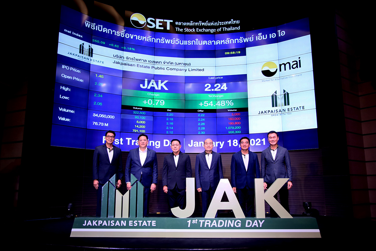 มิติหุ้น – พลเรือเอก ณะ อารีนิจ (ที่ 3 จากขวา) ประธานกรรมการ บริษัท จักรไพศาล เอสเตท จำกัด (มหาชน) (JAK) และคุณวีระพันธ์ จักรไพศาล (ที่3 จากซ้าย) กรรมการผู้จัดการ พร้อมด้วย คณะกรรมการบริษัทฯ ถ่ายภาพเป็นที่ระลึกร่วมกับ คุณแมนพงศ์ เสนาณรงค์ (ที่ 2 จากซ้าย)รองผู้จัดการ หัวหน้าสายงานผู้ออกหลักทรัพย์ ตลาดหลักทรัพย์แห่งประเทศไทย คุณชนะชัย จุลจิราภรณ์ (ขวา) ประธานเจ้าหน้าที่บริหาร บริษัทหลักทรัพย์ เอเอสแอล จำกัด ในฐานะผู้จัดการการจัดจำหน่ายและรับประกันการจำหน่าย และ คุณวรชาติ ทวยเจริญ (ที่ 2 จากขวา) กรรมการผู้จัดการ บริษัท ฟินเน็กซ์ แอ๊ดไวเซอรี่ จำกัดในฐานะที่ปรึกษาทางการเงิน ร่วมแสดงความยินดีในโอกาสที่ JAK เข้าซื้อขายในตลาดหลักทรัพย์ เอ็ม เอ ไอ เป็นวันแรก ณ หอประชุมศุกรีย์ แก้วเจริญ อาคารตลาดหลักทรัพย์แห่งประเทศไทย ย้ำความเชื่อมั่นในฐานะผู้เชี่ยวชาญในธุรกิจพัฒนาโครงการอสังหาริมทรัพย์ ทั้งประเภทแนวราบและแนวสูงโครงการคอนโดมิเนียม ที่ประสบความสำเร็จมายาวนานหลายโครงการ โดยราคาหุ้น JAK เปิดการซื้อขายในราคาที่ 2.26 บาท ให้ผลตอบแทนนักลงทุนกว่า 55.86% จากราคาไอพีโอ 1.45 บาท