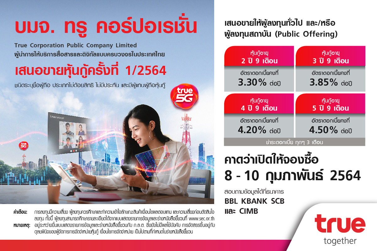 มิติหุ้น – กลุ่มทรู ผู้นำโครงสร้างพื้นฐานโทรคมนาคมดิจิทัล เดินหน้าสร้างสรรค์นวัตกรรมสินค้าและบริการรองรับการใช้ชีวิตและวิถีธุรกิจในยุคใหม่ (Next Normal) เพื่อร่วมขับเคลื่อนเศรษฐกิจและประเทศให้เติบโตอย่างยั่งยืนไปด้วยกัน เตรียมเปิดให้จองซื้อหุ้นกู้ชนิดระบุชื่อผู้ถือ ประเภทไม่ด้อยสิทธิ ไม่มีประกัน และมีผู้แทนผู้ถือหุ้นกู้ ซึ่งจะเสนอขายให้แก่ผู้ลงทุนทั่วไป (Public Offering) จำนวน 4 ชุดอายุหุ้นกู้ตั้งแต่ 2 ปี 9 เดือนถึง 5 ปี 9 เดือน อัตราดอกเบี้ยคงที่ระหว่าง 3.30–4.50% ต่อปี โดยบริษัทฯและหุ้นกู้ได้รับการจัดอันดับความน่าเชื่อถือในระดับ BBB+แนวโน้มอันดับเครดิต “คงที่” โดยบริษัท ทริสเรทติ้ง จำกัด เมื่อวันที่ 1 ธันวาคม 2563คาดว่าจะเปิดให้จองซื้อในวันที่ 8–10 กุมภาพันธ์ 2564 ผ่านธนาคารผู้จัดการการจัดจำหน่ายหุ้นกู้ 4 แห่ง ได้แก่ ธนาคารกรุงเทพ ธนาคารกสิกรไทย ธนาคารไทยพาณิชย์ และธนาคาร ซีไอเอ็มบี ไทย