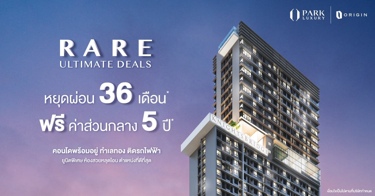 มิติหุ้น – พาร์ค ลักชัวรี่ ผู้พัฒนาอสังหาริมทรัพย์ระดับลักชัวรี่ ในเครือออริจิ้น พร็อพเพอร์ตี้ เปิดดีลสุดคุ้มรับปีใหม่ คัดห้องสวยหลุดโอนจาก 6 โครงการคอนโดมิเนียมไฮเอนด์ 6 ทำเลศักยภาพใกล้รถไฟฟ้า แบรนด์ไนท์บริดจ์ (KnightsBridge) ร่วมแคมเปญ “Rare Ultimate Deals” มอบสิทธิพิเศษ ผ่อนให้ สูงสุด 36 เดือน* หรือฟรีค่าส่วนกลาง 5 ปี พร้อมสิทธิพิเศษอื่นๆ ให้เลือกฟินรวมสูงสุดถึง 3 ต่อ อาทิ ฟรี!เฟอร์นิเจอร์* ฟรี!เครื่องใช้ไฟฟ้า* ฟรี!ค่าใช้จ่าย ณ วันโอน* ฟรี!บัตร BTS 2 ปี* ฟรี!บัตรเติมน้ำมัน 1 ปี* หรือฟรี! e-Voucher ของ Grab 1 ปี*