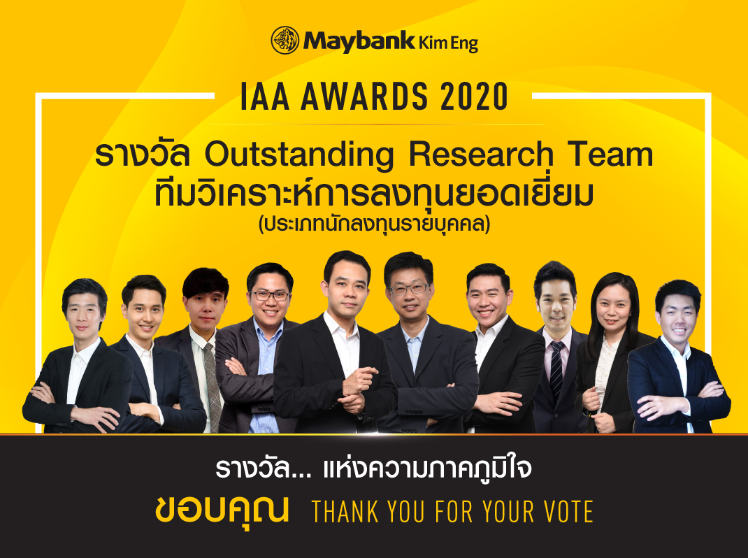 โดยงานวิจัยของเมย์แบงก์ กิมเอ็ง ถือเป็นที่ยอมรับจากนักลงทุนว่ ามีประโยชน์ และสามารถนำมาเป็นแนวทางในการตั ดสินใจได้จริงจนเป็นที่ยอมรั บในวงกว้าง ล่าสุดนักวิเคราะห์จากทีมวิจั ยของเมย์แบงก์ กิมเอ็ง ยังได้รับรางวัลจากเวที IAA Best Analyst Award 2020 มากถึง 6 รางวัล ได้แก่ รางวัล ทีมวิเคราะห์การลงทุนยอดเยี่ยม ประเภทนักลงทุนรายบุคคล (Outstanding Research Team), นายสุรชัย ประมวลเจริญกิจ รางวัลนักวิเคราะห์ยอดเยี่ยม Outstanding ประเภทนักลงทุนรายบุคคล – กลุ่มสินค้าอุตสาหกรรม (ไม่รวมปิโตรเคมี), นายจรูญพันธ์ วัฒนวงศ์ รางวัลนักวิเคราะห์ยอดเยี่ยม Outstanding ไม่แยกประเภทนักลงทุนรายสถาบั นและรายบุคคล – กลุ่มตลาด mai, นายเจษฎา เตชะหัสดิน รางวัลนักวิเคราะห์ยอดเยี่ยม Outstanding ประเภทนักลงทุนรายสถาบันและนั กลงทุนรายบุคคล – กลุ่มธุรกิจการเงิน, นาย กฤษณ์พงศ์ ปาทาน รางวัลนักวิเคราะห์ยอดเยี่ยม Outstanding ไม่แยกประเภทนักลงทุนรายบุ คคลและรายสถาบัน – นักวิเคราะห์ทางเทคนิค ซึ่งรางวัลดังกล่าวสะท้อนถึงคุ ณภาพงานวิจัยของ เมย์แบงก์ กิมเอ็ง โดยทุกเสียงโหวตจากนักลงทุ นจะเป็นกำลังใจให้ทีมวิจัยเร่ งพัฒนาผลงานอย่างต่อเนื่อง ไม่หยุดนิ่ง เพื่อสร้างผลงานวิจัยที่โดดเด่น และเป็นข้อมูลสำคัญให้แก่นั กลงทุน ใช้ประกอบการตัดสินใจลงทุนต่อไป