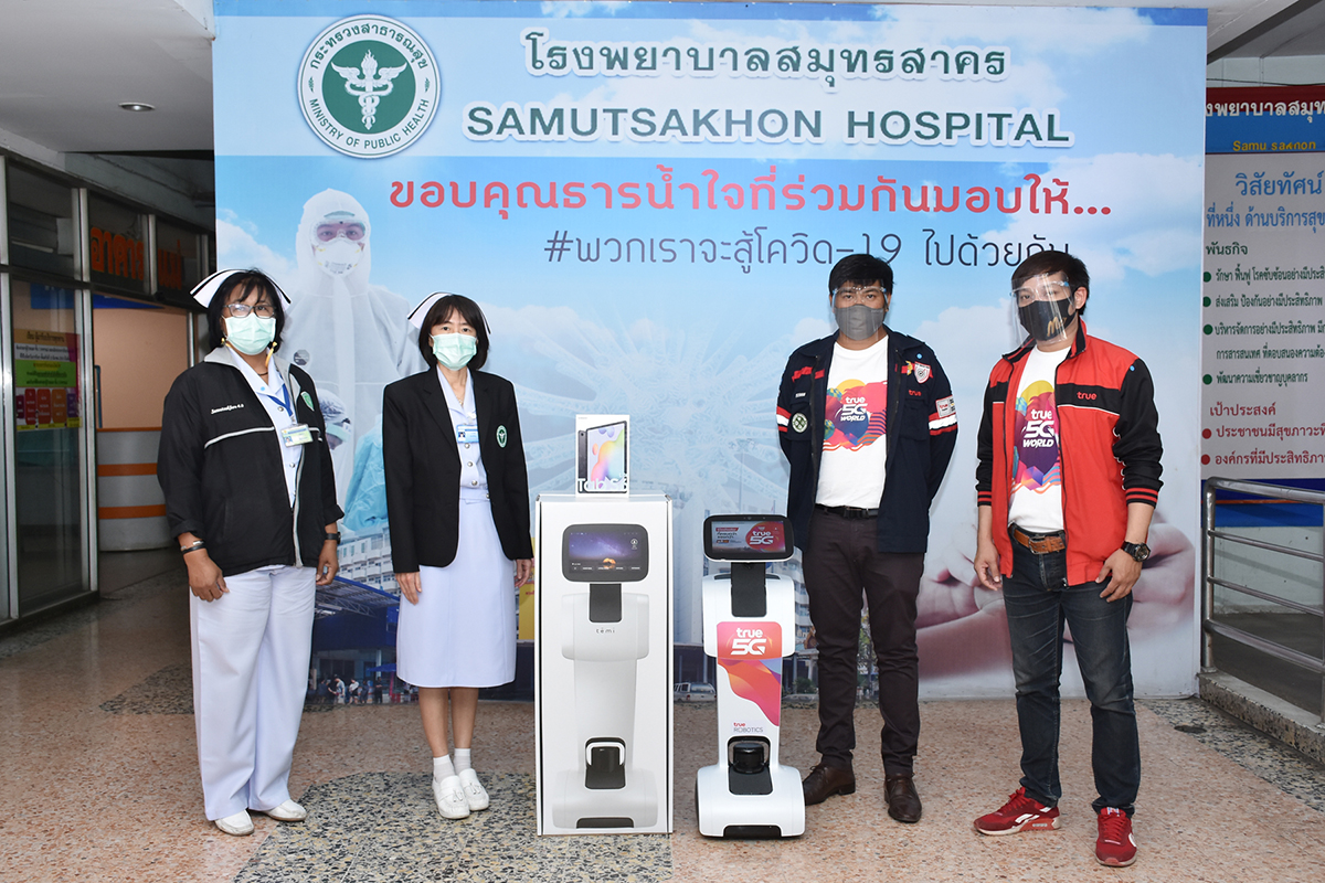 มิติหุ้น – กลุ่มทรู เดินหน้าเคียงคู่คนไทยให้ชนะ โควิด-19 ไปด้วยกัน พร้อมสนับสนุนภารกิจบุคลากรทางการแพทย์อย่างต่อเนื่อง ล่าสุด กลุ่มทรู โดย นายพุทธรักษา เพ็ญสาดแสง (ที่ 2 จากขวา) District Manager และนายภารดร หมุยจินดา (ขวาสุด) Senior Area Owner จ.สมุทรสาคร บมจ.ทรู คอร์ปอเรชั่น เป็นตัวแทนส่งมอบหุ่นยนต์อัจฉริยะ True 5G “เทมิ” พร้อมแท็บแล็ตควบคุมการใช้งาน แก่โรงพยาบาลสมุทรสาคร โดย นางสาววรารัตน์ ทองศิริมา พยาบาลวิชาชีพชำนาญการ (ที่ 2 จากซ้าย) หัวหน้าหน่วยงานงาน OPD MED และนางสาวรัตนา ยี่สุ่นเทศ (ซ้ายสุด) พยาบาลวิชาชีพชำนาญการ หัวหน้าหน่วยงานประกันสังคมชาย เป็นผู้รับมอบหุ่นยนต์อัจฉริยะ True 5G “เทมิ” ควบคุมผ่านเครือข่ายอัจฉริยะ True 5G ที่เร็วแรงกว่า รายแรก รายเดียว ครบสุดทุกย่านความถี่ ซึ่งจะช่วยอำนวยความสะดวกให้แพทย์พยาบาล ในการดูแลผู้ป่วยได้จากระยะไกล ทั้งติดตามอาการและให้คำแนะนำในการรักษา โดยไม่จำเป็นต้องเข้าใกล้ผู้ป่วย ลดการสัมผัสและความเสี่ยงติดเชื้อ และทำให้สามารถดูแลคนไข้ได้อย่างทั่วถึงมากยิ่งขึ้น นับเป็นอีกหนึ่งความตั้งใจของกลุ่มทรูที่จะเคียงคู่คนไทยให้ชนะโควิด-19 ไปด้วยกัน