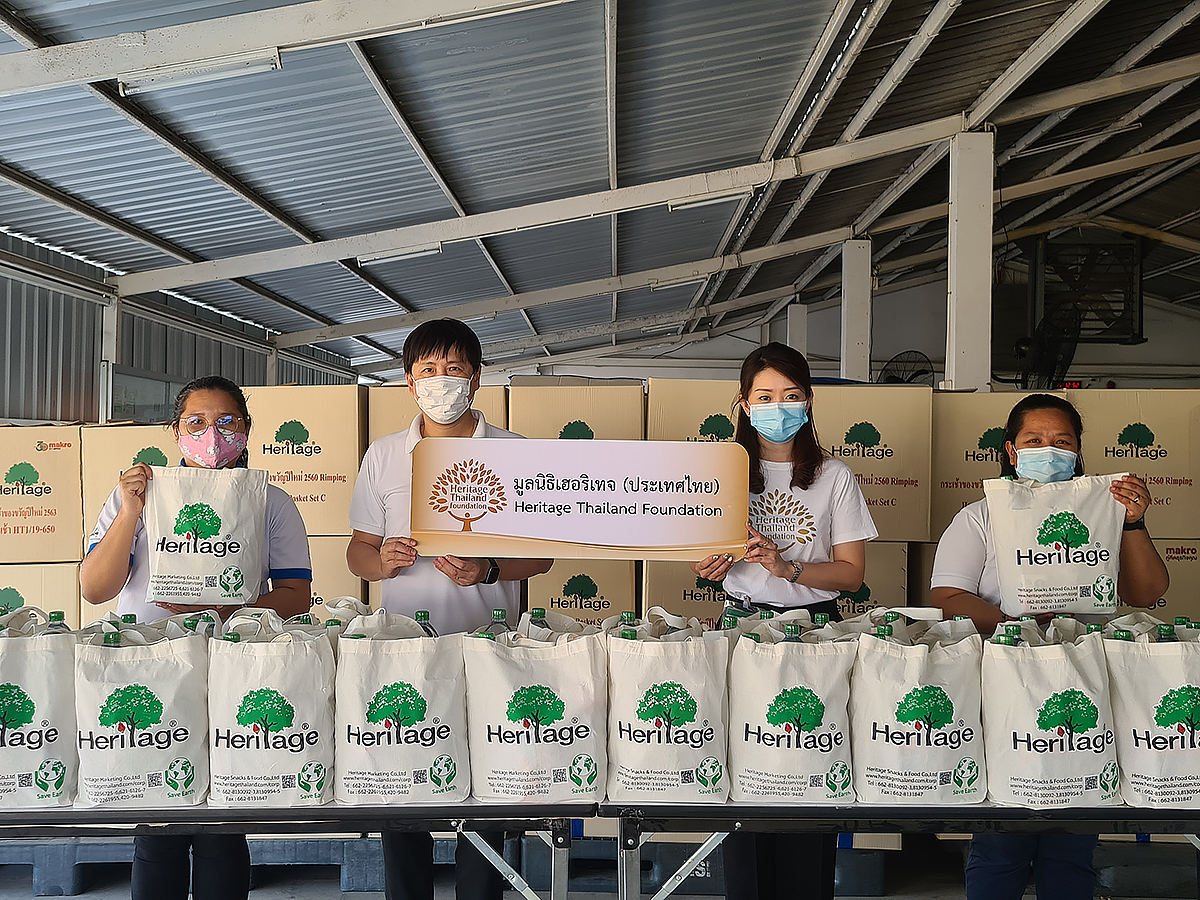 มิติหุ้น – สมุทรสาคร – มูลนิธิเฮอริเทจ (ประเทศไทย) ภายใต้การดูแลของเครือเฮอริเทจ ผู้ผลิตและจัดจำหน่ายอาหารและเครื่องดื่มเพื่อสุขภาพ นำโดย วลัยทิพย์ ซื่อตรงมั่นคง (ที่ 2 จากขวา) ผู้อำนวยการฝ่ายสื่อสารองค์กร เครือเฮอริเทจ ร่วมด้วย ธีรวัฒน์ กิตติธนทรัพย์ (ที่ 2 จากซ้าย) ผู้จัดการฝ่ายความปลอดภัยและสิ่งแวดล้อม เครือเฮอริเทจ พร้อมพนักงานในเครือฯ ร่วมใจส่งผลิตภัณฑ์อาหารและเครื่องดื่มในเครือฯ อย่าง นมอัลมอนด์ นมพิสทาชิโอ น้ำดื่ม ข้าวสาร และขนมขบเคี้ยวต่างๆ เช่น ถั่ว และคุกกี้ พร้อมสิ่งของจำเป็นในชีวิตประจำวัน อาทิ แปรงสีฟัน ยาสีฟัน สบู่ และยาสระผม รวมมูลค่ากว่า 300,000 บาท หวังช่วยเหลือและเป็นพลังให้ชาวตลาดกลางกุ้งที่เดือดร้อน ปลอดภัยจากสถานการณ์การแพร่ระบาดของเชื้อโควิด 19 ณ โรงงานเฮอริเทจ อำเภอกระทุ่มแบน จังหวัดสมุทรสาคร เมื่อวันก่อน