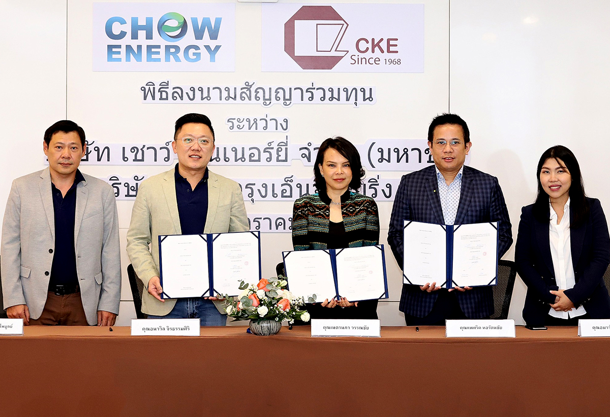 มิติหุ้น – นายอนาวิล จิรธรรมศิริ ( ที่ 2 จากซ้าย) ประธานกรรมการบริหาร บริษัท เชาว์ สตีล อินดัสทรี้ จำกัด (มหาชน) หรือ CHOW ผู้ประกอบธุรกิจผลิตและจำหน่ายผลิตภัณฑ์เหล็กแท่งยาว (Steel Billet) รายใหญ่ของประเทศ และธุรกิจพลังงานทดแทนประเภทพลังงานแสงอาทิตย์ และ นายธนชาต เผ่าพงษ์ไพบูลย์ (ซ้าย) ประธานเจ้าหน้าที่ฝ่ายปฎิบัติการ บริษัท เชาว์ เอนเนอร์ยี่ จำกัด (มหาชน) ผู้ประกอบธุรกิจพลังงานทดแทนในเครือ CHOW GROUP ลงนามในสัญญาร่วมทุน กับบริษัท เจริญกรุงเอ็นจิเนียริ่ง จำกัด โดยนางเนตรนภา วรรณชัย (ที่ 3 จากขวา) กรรมการผู้จัดการ และ นายแพทริค หอรัตนชัย (ที่ 2 จากขวา) เพื่อจัดตั้งบริษัท เชาว์ แอนด์ ซีเคอี รีนิวเอเบิ้ล จำกัด ดำเนินธุรกิจรับเหมาติดตั้งระบบผลิตพลังงานแสงอาทิตย์บนหลังคา (Solar Rooftop) ร่วมกัน ณ ห้องประชุมใหญ่ บริษัท เชาว์ สตีล อินดัสทรี้ จำกัด (มหาชน) ชั้น 10 อาคารเอฟวายไอ เซ็นเตอร์2 คลองเตย เมื่อเร็วๆ นี้