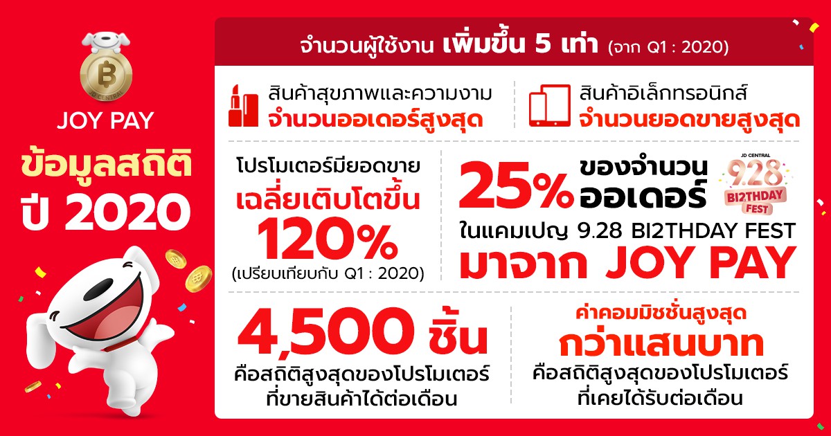 สำหรับ JOY PAY หลังจากเปิดตัวเมื่อต้นปี 2563 พบว่าเมื่อถึงสิ้นปี มีจำนวนผู้ใช้งานเพิ่มขึ้นถึง 5 เท่า จากสถิติพบว่า โปรโมเตอร์ที่ขายสินค้าได้มากสุด สามารถทำได้ถึง 4,500 ชิ้น/เดือน และสามารถทำยอดคอมมิชชั่นได้สูงสุดเป็นหลักแสนบาท ยอดขายเฉลี่ยต่อโปรโมเตอร์ มีอัตราการเติบโตถึง 120% เมื่อเทียบกับช่วงต้นปี สินค้าที่มีออเดอร์ผ่านโปรโมเตอร์สูงสุด คือสินค้ากลุ่มสุขภาพและความงาม