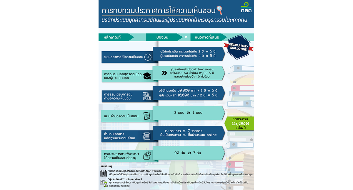 ตามที่สำนักงานคณะกรรมการกำกับหลักทรัพย์และตลาดหลักทรัพย์ (ก.ล.ต.) ได้กำหนดแผนยุทธศาสตร์ด้านการสร้างความสามารถในการแข่งขันด้วยการมีกฎระเบียบที่ได้มาตรฐาน ภายใต้แนวทาง Regulatory Guillotine* โดยมีเป้าหมายให้กฎเกณฑ์ของ ก.ล.ต. มีมาตรฐานและสอดคล้องกับบริบทต่าง ๆ ที่เปลี่ยนแปลงไป เพื่อให้มีกฎเกณฑ์เท่าที่จำเป็นและการใช้บังคับเป็นไปอย่างมีประสิทธิภาพ โดยผู้ลงทุนยังคงได้รับการคุ้มครองที่เหมาะสมและผู้ประกอบการมีความสะดวกในการประกอบธุรกิจ