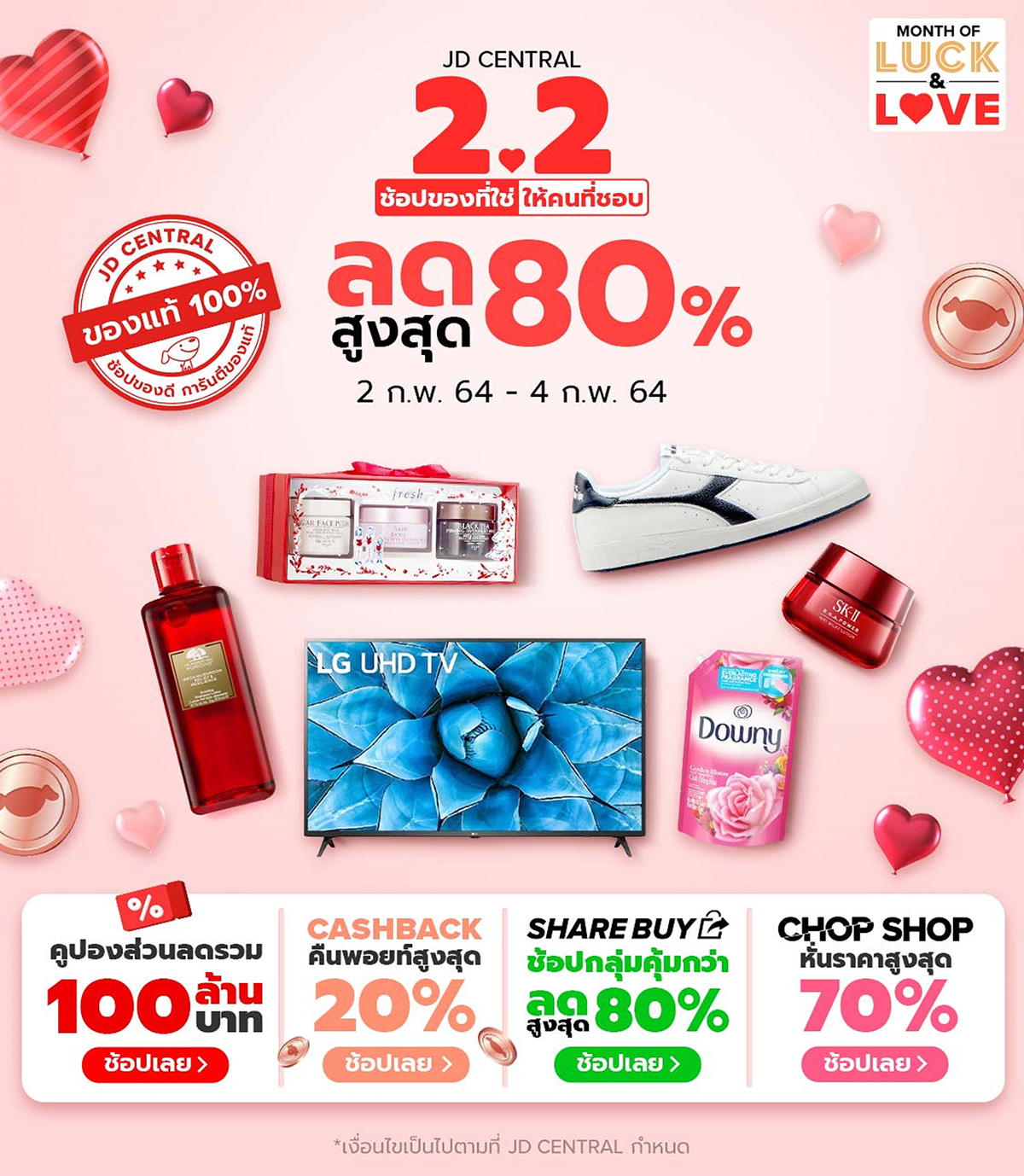 เริ่มจาก แคมเปญ “2.2 ช้อปของที่ใช่ ให้คนที่ชอบ” ลดสูงสุดถึง 80% คูปองส่วนลดรวม 100 ล้านบาท รับ JD POINT สูงสุด 10% อีกทั้งยังมีแคมเปญช้อปแบบกลุ่มคุ้มกว่า ด้วยส่วนลดสูงสุด 80% และ CHOP SHOP ที่หั่นราคาสูงสุดถึง 70% ช้อปกันได้วันนี้ – 4 กุมภาพันธ์นี้ กับดีลพิเศษที่จัดมาเฉพาะลูกค้าของเจดีเซ็นทรัล ได้แก่